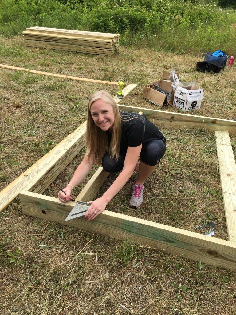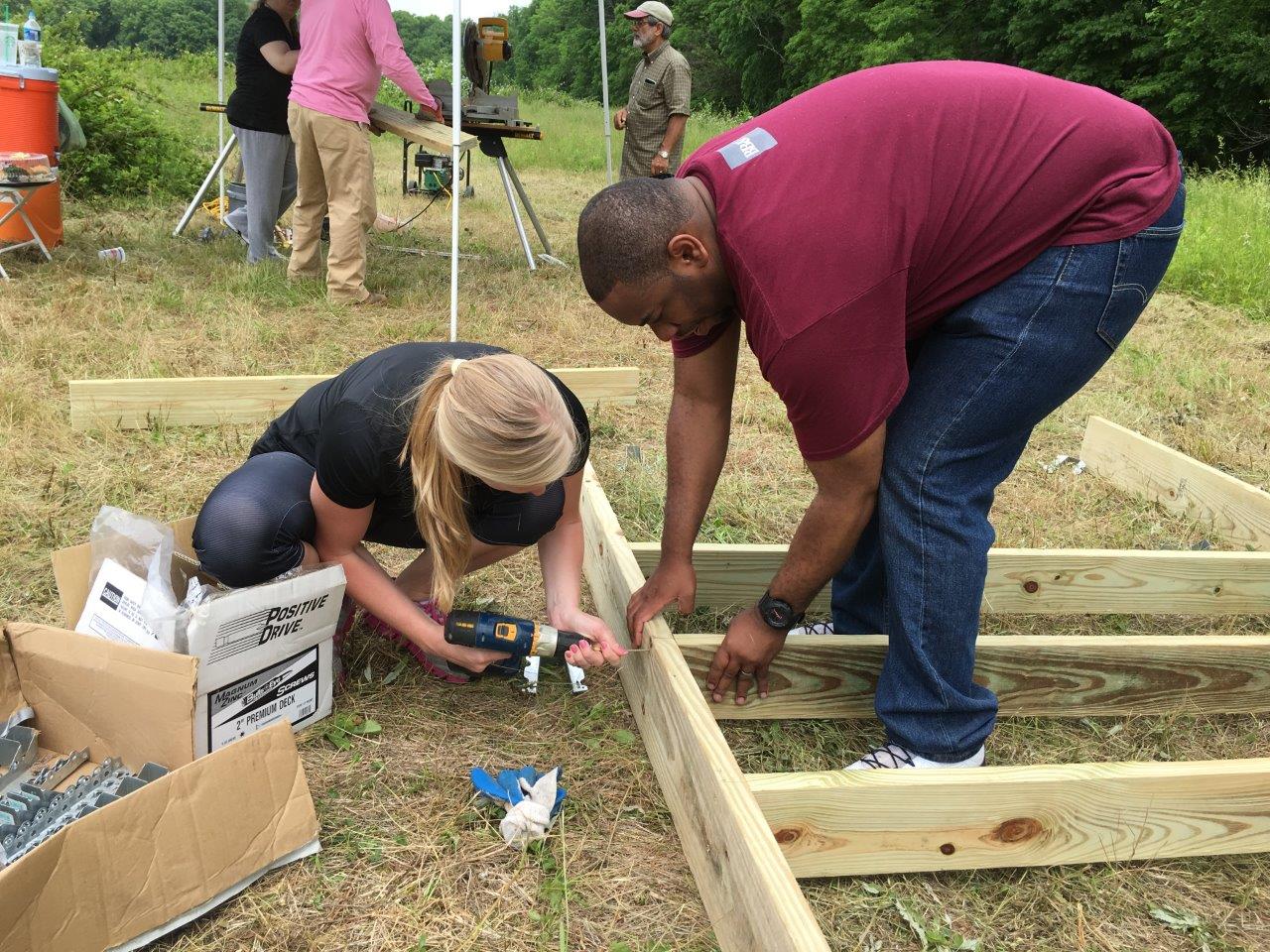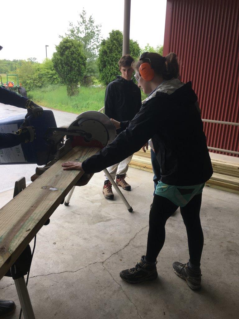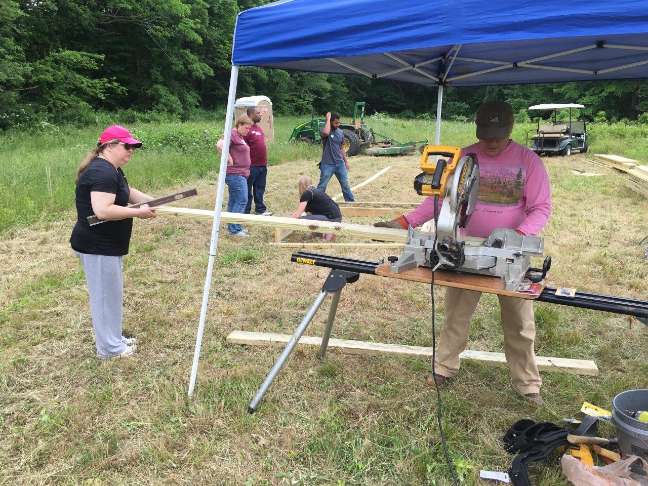 The design for the platform was an elongated rectangle consisting of 2 rows of 4 modules. On a rainy day in May, the first team of associates worked on cutting the lumber down to size. They then constructed a module to to serve as a sample for the next team. In June, the second team visited to get down to work! The associates helped transport the lumber down to the site, and then began construction! Despite the muggy weather, the team was in high spirits and finished 2 more modules.