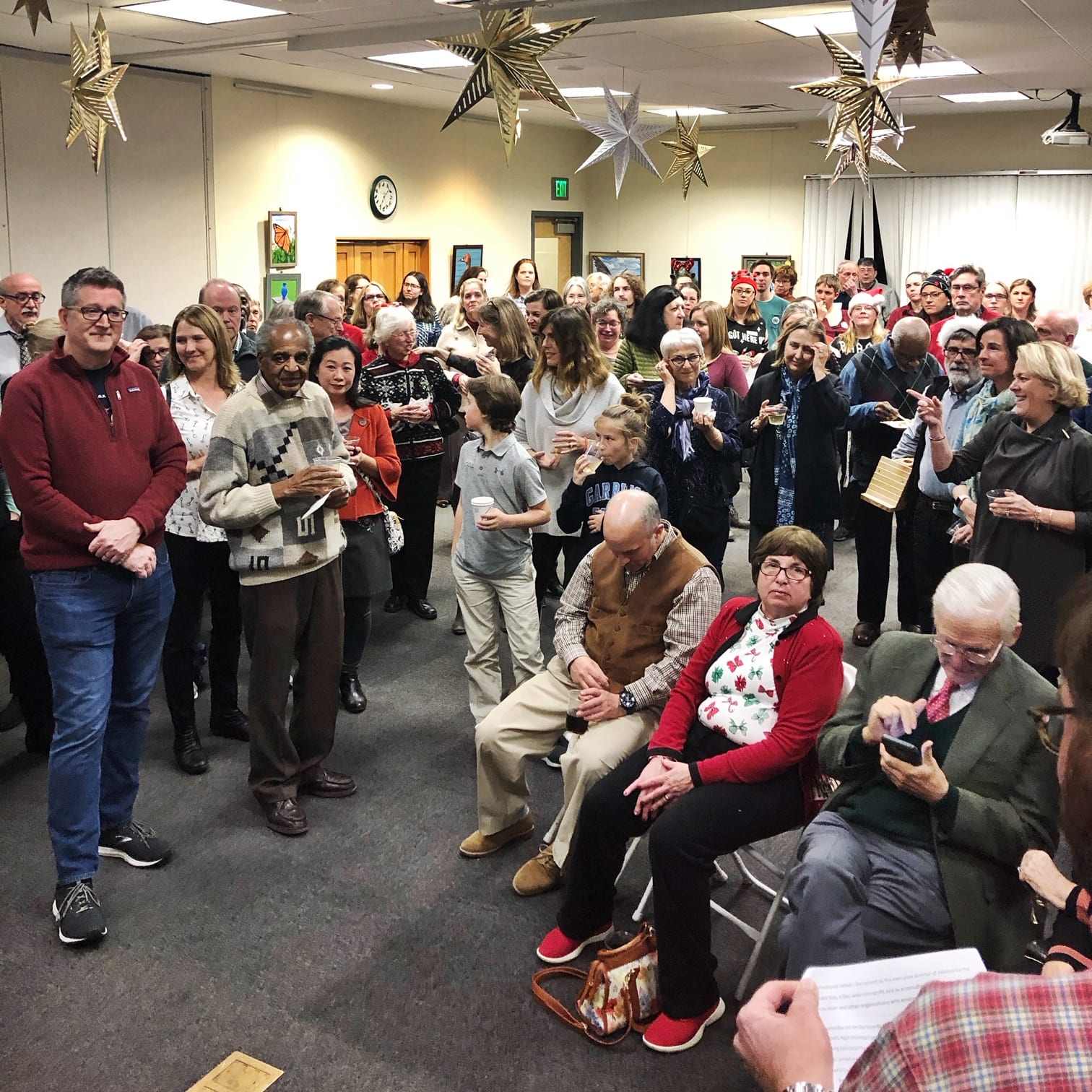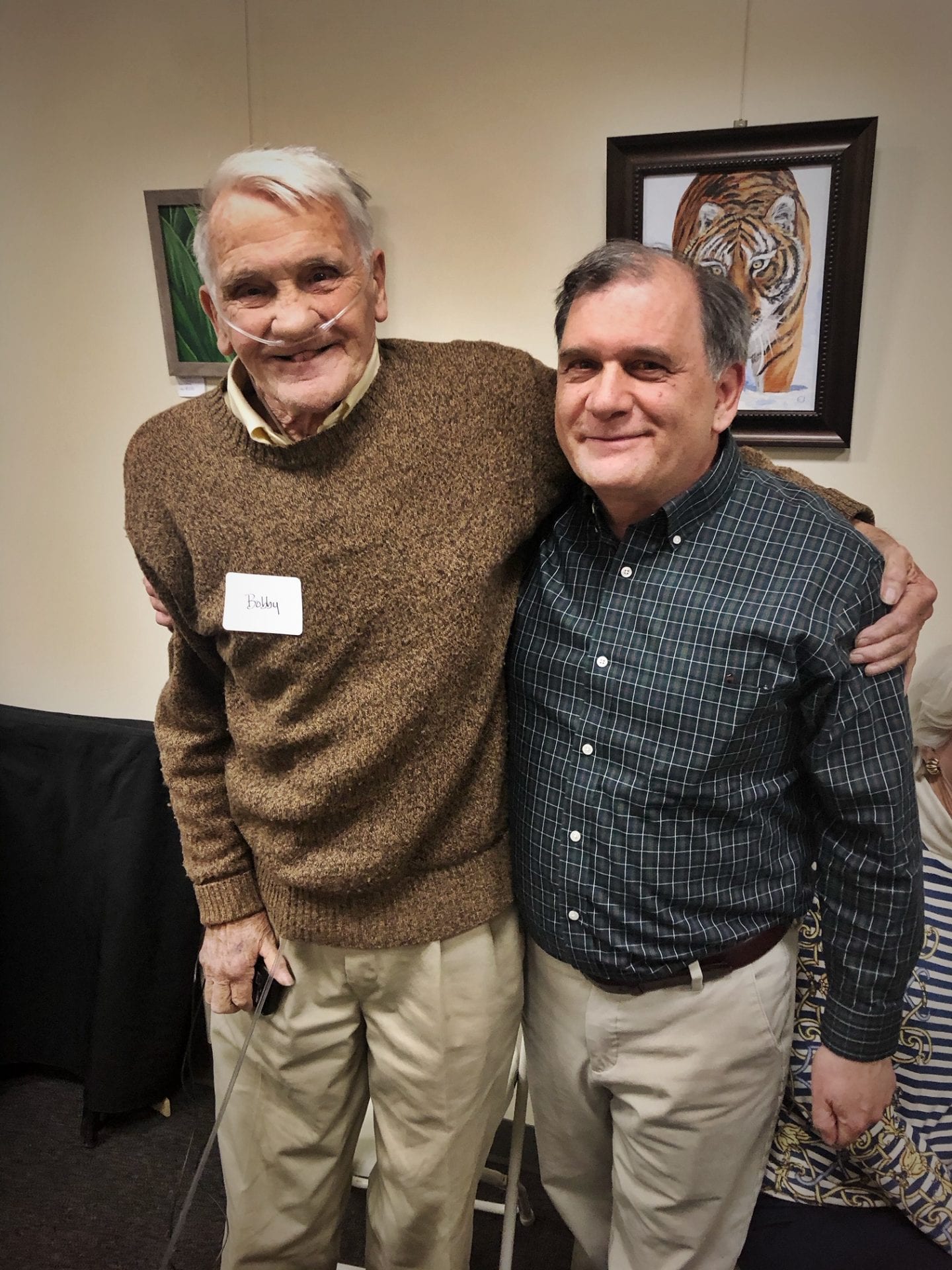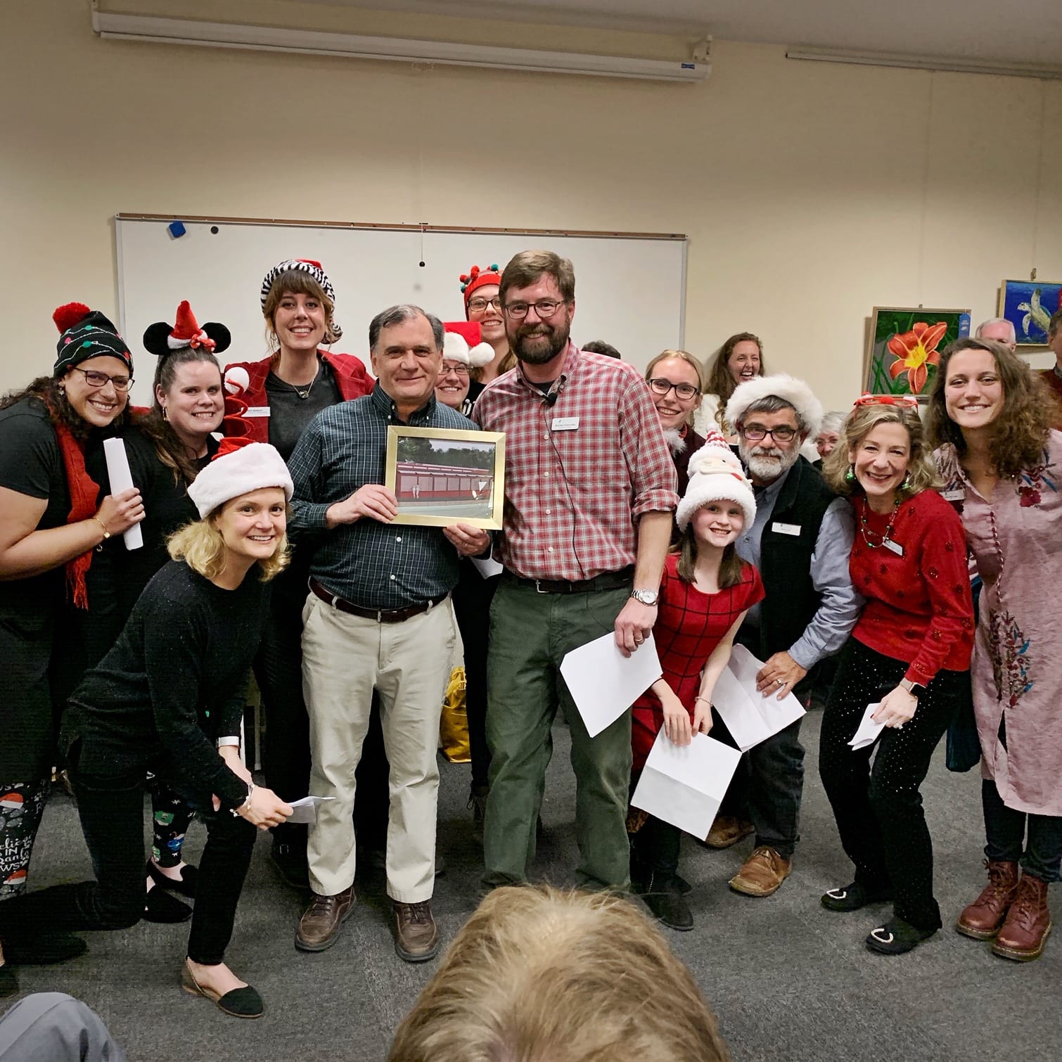 Delegate Jon Cardin spoke about Rob’s three decades of dedicated service to our community and presented Rob with an official recognition from the Maryland General Assembly. Carlos Gonzalez from the Office of Baltimore County Councilman Izzy Patoka presented Rob with well wishes from the Baltimore County Council. Trustee Emeritus Bobby Johnson shared a beautiful poem he had written in honor of Rob, while Trustee Emeritus and Former Irvine Executive Director Dick Gibbs regaled the crowd with his favorite memories of Rob. Longtime volunteers Brigitte Harper and Sue and Tim Davis presented Rob with his own handmade bluebird box in memory of his 25 years of stewardship of Irvine’s bluebird population. To close out the program, members of Irvine’s staff presented Rob with an original song. Set to The 12 Days Of Christmas, the lyrics memorialized Rob’s storied career and its many highlights. On the final verse, the staff let the evening’s biggest surprise out of the bag: our new aviary will soon officially be called The Robert L. Mardiney Aviary. We thought it was only fitting to bestow this honor on Rob, the staff member who brought raptors to Irvine nearly 30 years ago.