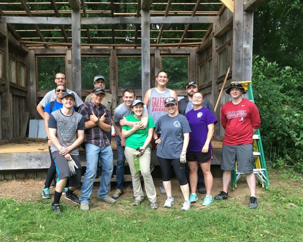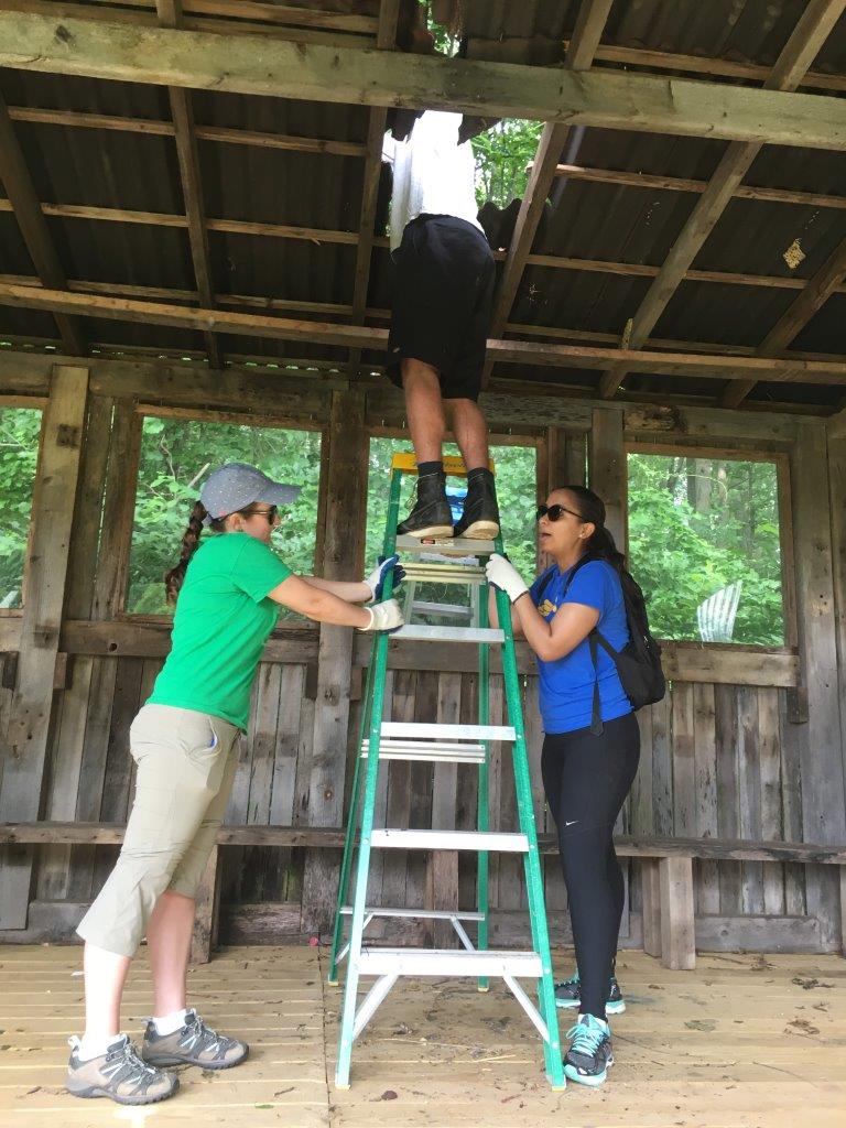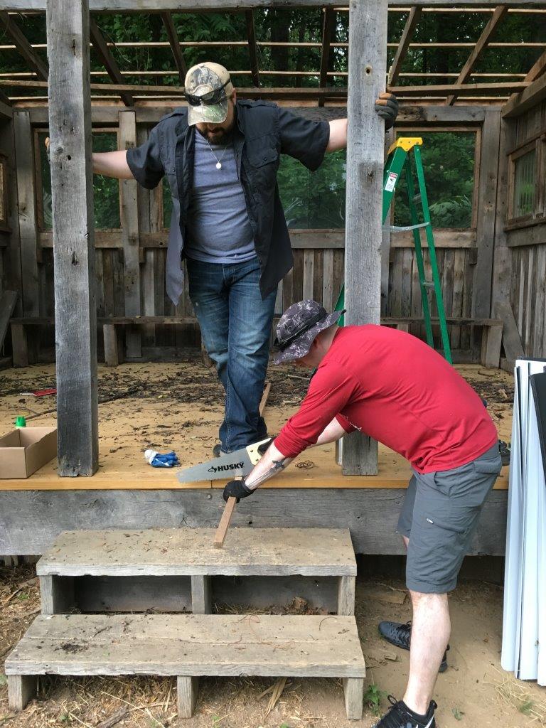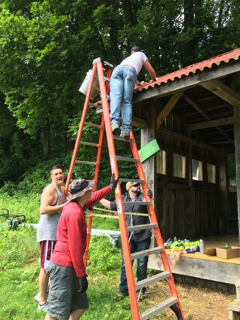 Earlier this year, Eagle Scout Caleb Hobby replaced the floor of Irvine’s education hut. The final step of the makeover was to install a new roof – but we needed a team of volunteers that were up for the job! In came 10 volunteers from the Air Force’s Fort Meade base.