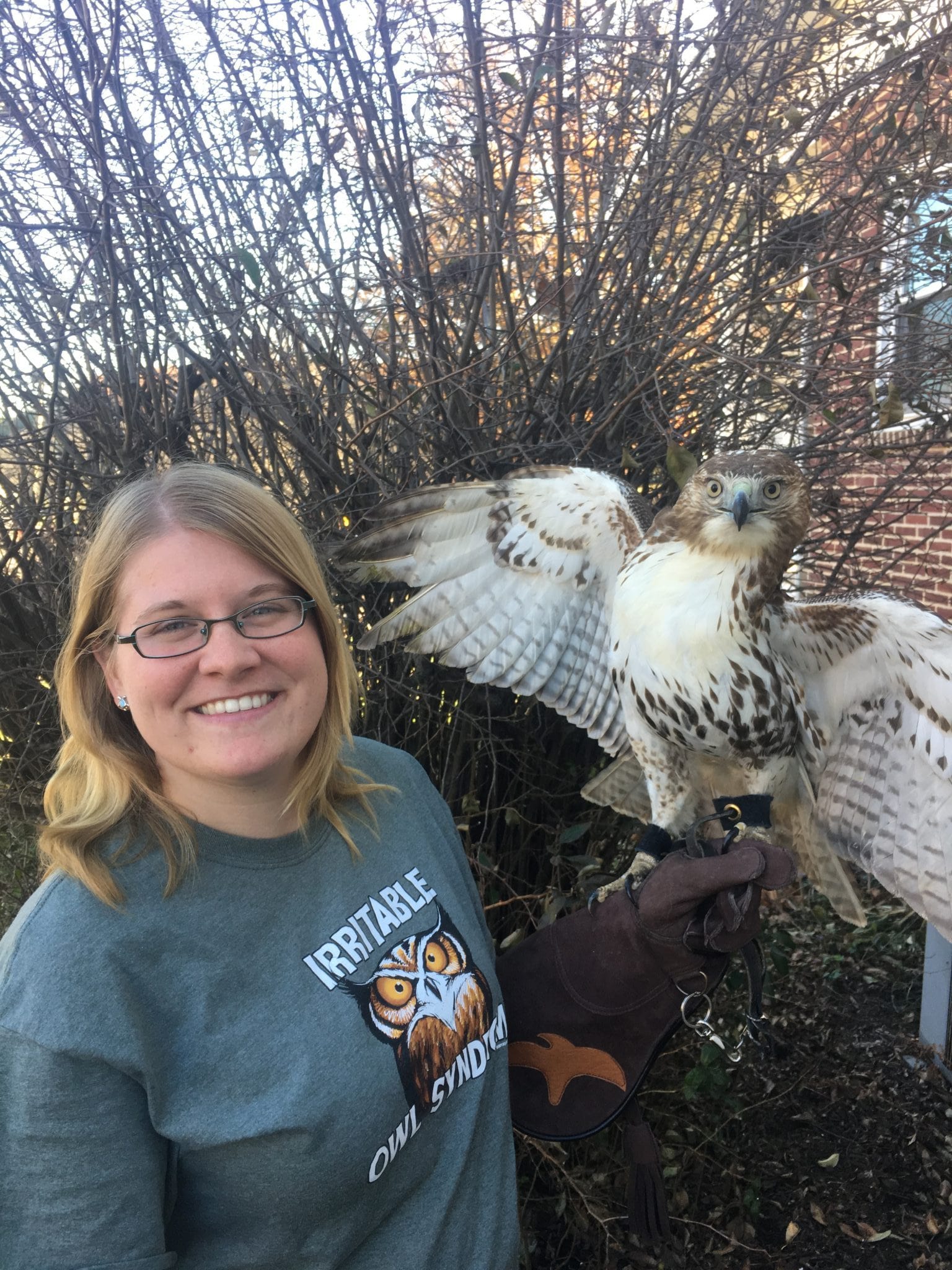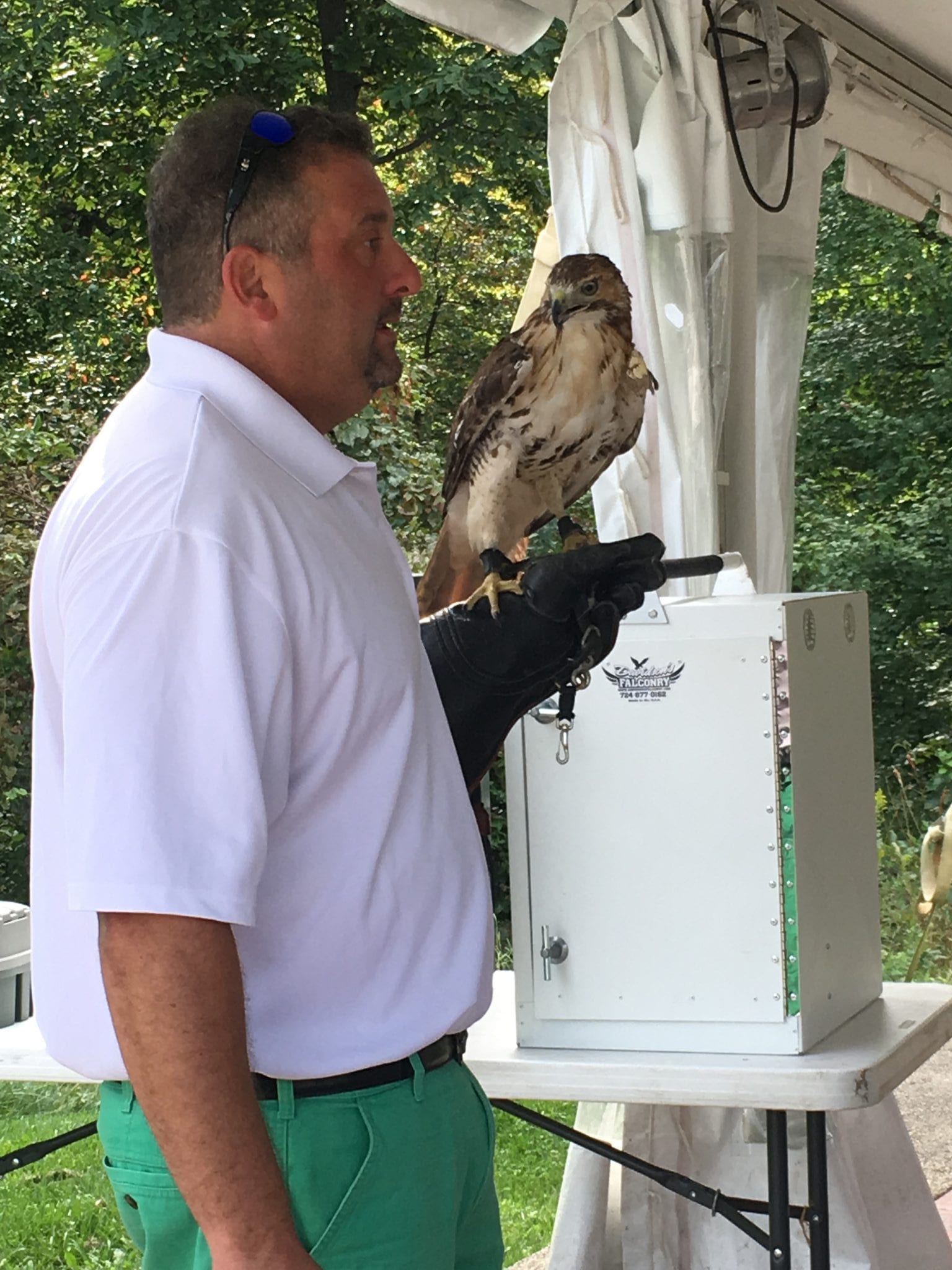 By stroke of pure luck (and the fact that it really is a small world out there), I met Brian, who would become my sponsor, through a high school friend. My friend, who now volunteers at Irvine, works at our local grocery store. One day I get a call from a random number in the middle of leading summer camp. When I got around to listening to the voicemail I knew a great opportunity had presented itself! The voicemail went something like this: ‘Hi, my name is Brian and I am a licensed and practicing falconer who lives in Manchester, MD. I have a Red Tailed Hawk who is non-releasable and needs a home. I got your number from your friend at the grocery store and he said that Irvine might be able to take the hawk? Let me know!’ Well, long story short(er), we didn’t have the room here for another Red Tail at the moment, but I got a sponsor out of the deal!