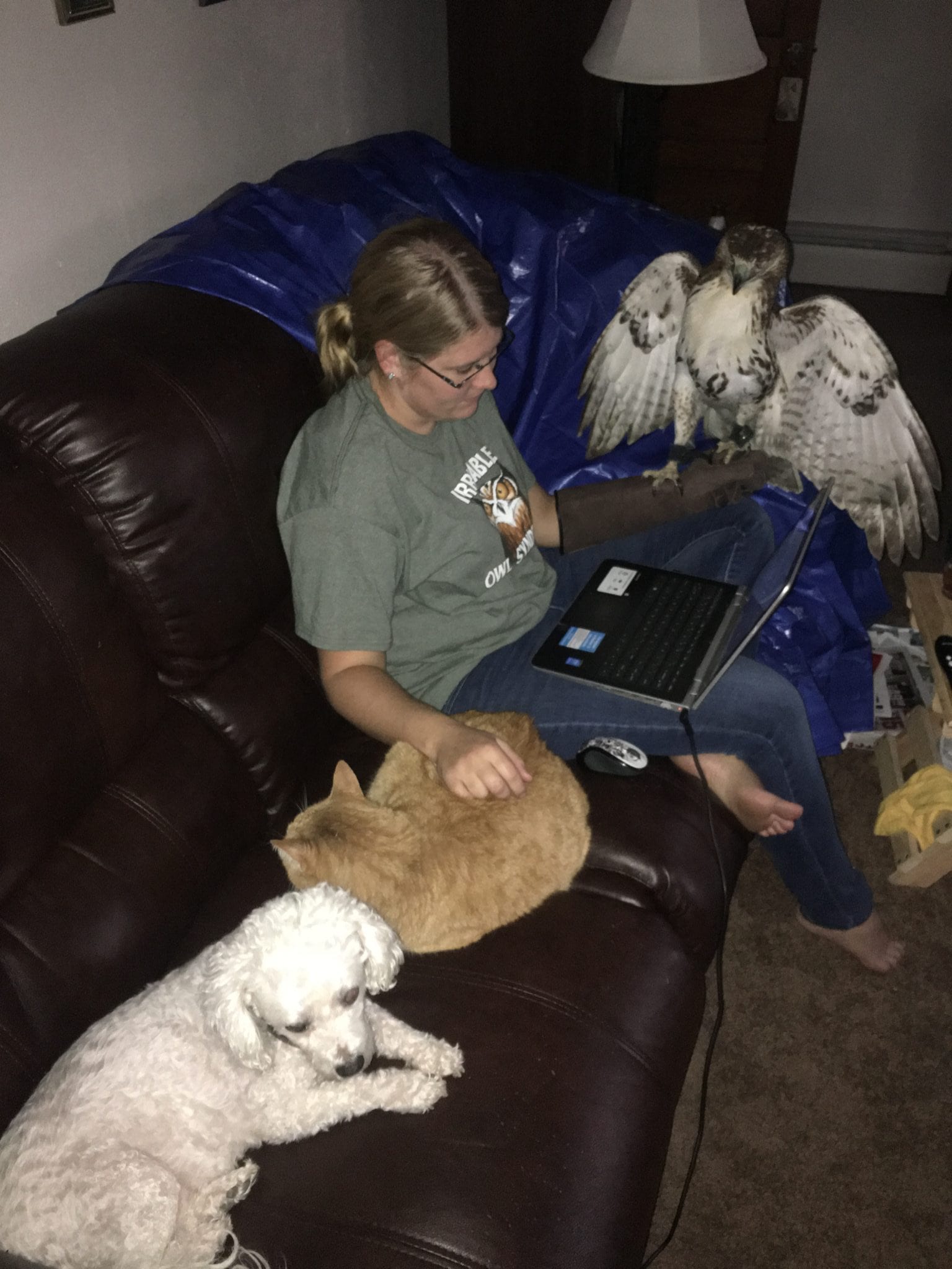 Seventh Step: Training. Half Check. Training your bird is where your bond begins and then grows and grows. Your bird will always retain her free and wild spirit, you are just taking the ingrained instinct of human fearfulness away as much as possible. She will learn from you and you will learn from her. The first step of training is to get her to sit on your glove without bating (flying away from you). Lady is a special bird, and was sitting on my glove calmly from day one. Other birds take a bit longer. Once they are comfortable with you, introduce them to other scary stimuli little by little in a safe and controlled setting. For me, that meant taking Lady to all of my family Thanksgiving dinners! She met all my aunts, uncles, cousins, friends, dogs, cats, birds, etc. Again, she wasn’t phased by any of this. By the end of the first day, Lady ate two mice from my gloved hand that I offered to her from a pair of tongs. By the second day, she was taking food gently from my hand. By a week, she made the leap of faith (literally) and hopped from her perch to my glove to get her food. Little by little she is making progress. I successfully got her to fly from a distance of about 4 feet to my glove for food before I noticed her wing drooping. She is now only allowed to eat from glove or gently hop to my glove until that heals up…then it’ll be back to flying to glove. Here is where my training has gotten to. The next part, once she is healed up, will be to keep increasing the distance she has to fly from her perch to my glove for food. I have implemented a whistle as another cue so that in the field, I should be able to whistle, hold my hand up, and have her come back to glove. Once she is flying from a good distance, I will put her on a creance. A creance is basically a really long, weighted dog leash. This way I still have control over her, but we can work on flying from longer distances. When she successfully and continuously flies from ~50 yards to my glove upon being called, it’s time to let her off the leash! The first free-flight will probably be the most terrifying thing in my life. I have to make the decision that I have trained her well, that I have kept track of her weight, and that I have bonded with her well enough that she will make the decision to return to my glove instead of soaring off into the horizon.