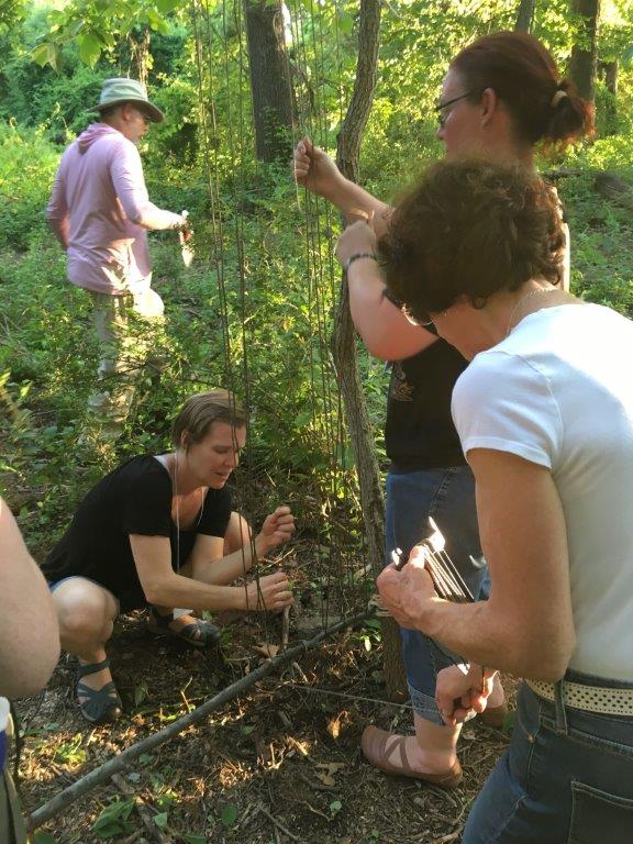 Does nature bring out your artistic side? Between Irvine’s Outdoor Classroom and Play Trail, we hope to inspire learners of all ages to interact with nature in many different ways. This year’s Nature Preschool Conference attendees constructed an outdoor weaving loom to be used by our creative preschool students, campers, and visitors! After choosing two trees an appropriate distance apart, the volunteers cleared out the invasive vines that were overtaking the area. They found downed branches to complete the frame, and attached them with biodegradable rope that will stretch to allow the trees to grow. Lastly, they strung durable nylon cord between the two branches, and used the vines we had pulled to test out the completed loom!
