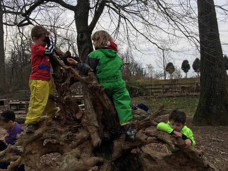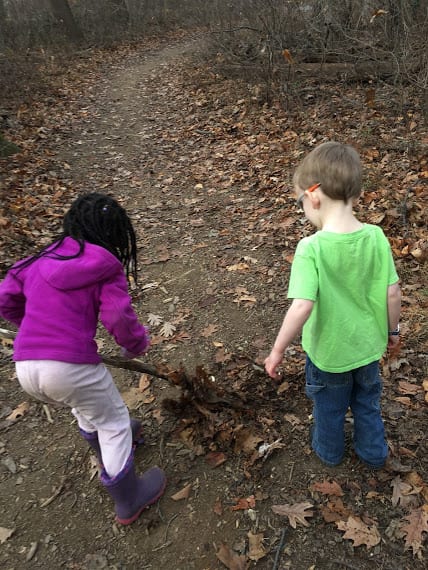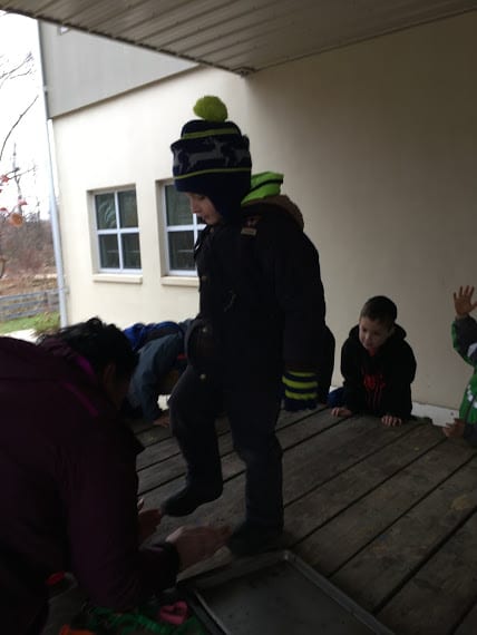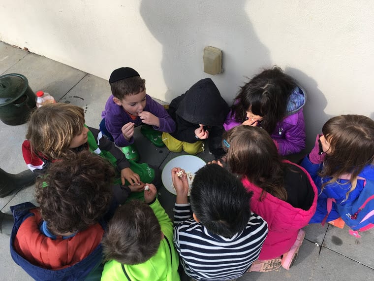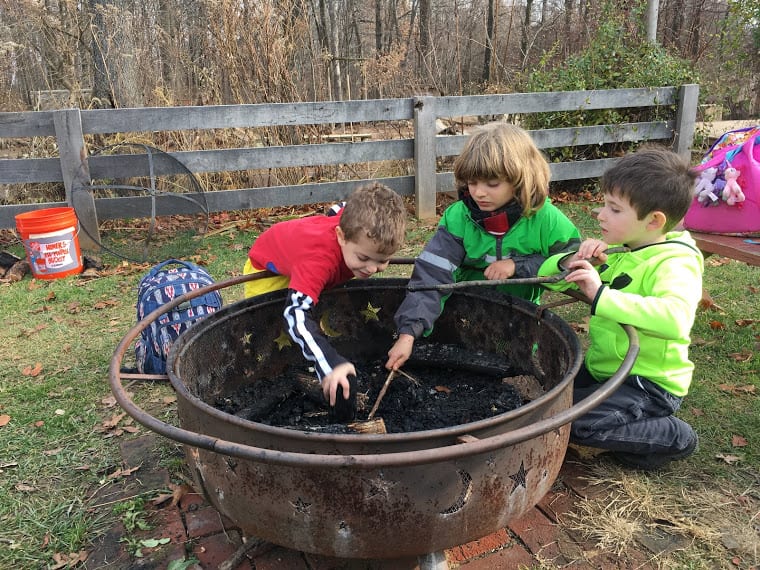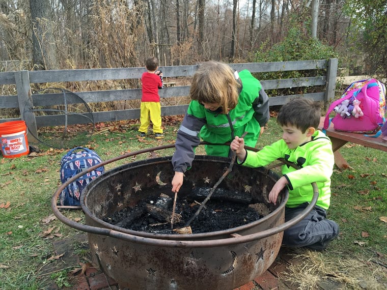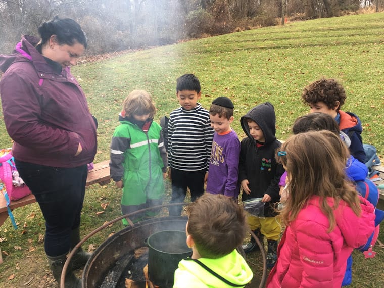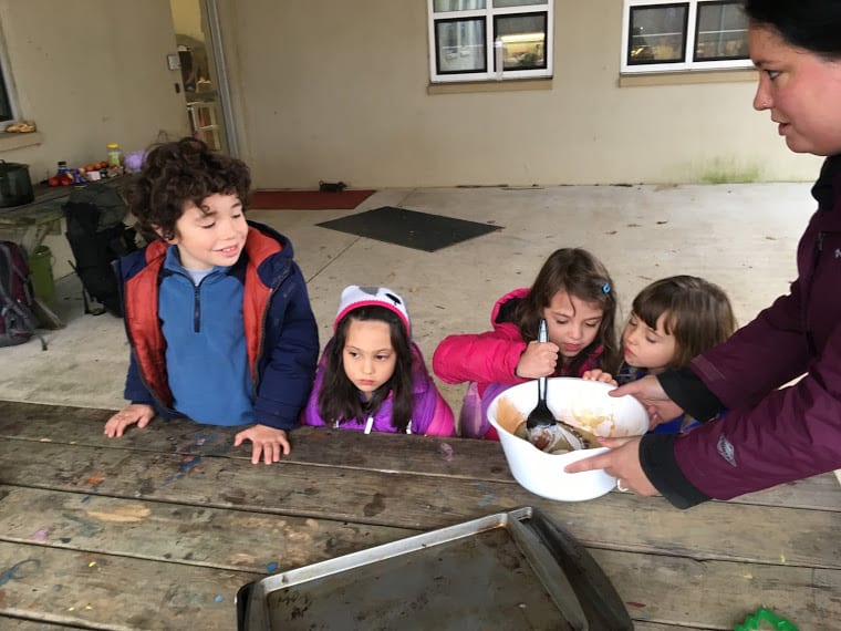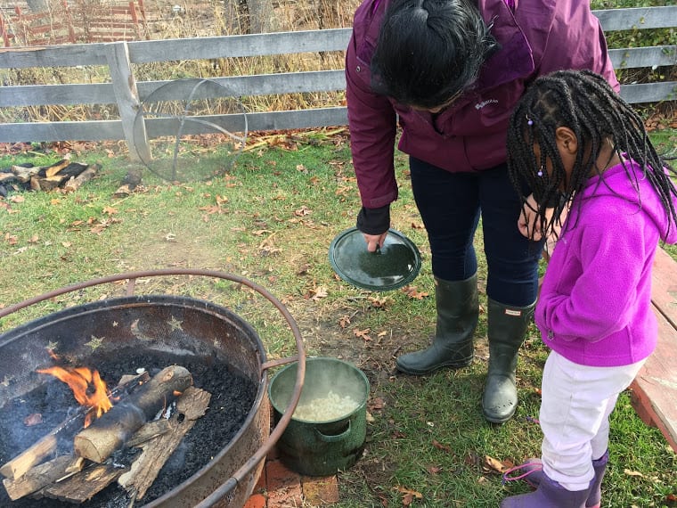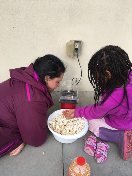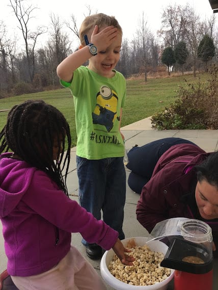 We also created explosions over the fire- don’t worry, they were contained, small explosions… popcorn! We watched the popcorn cook in the oil over the fire and then stood back when the explosions began shooting out of the pot! We covered and listened to the fireworks inside the pot. When it was done, we opened the pot and checked on our creation. It was a bit burned, so we decided to try popcorn another way- in an air popper! We plugged in the air popper and watched the kernels go crazy. When they started popping and spilling over into our big bowl, we couldn’t keep our hands off of it! Our Tuesday and Thursday class reminded Ms. Tara and Ms. Paula of starving raccoons. The huge bowl of fluffy, white popcorn was gone in seconds! It was pretty laughable!