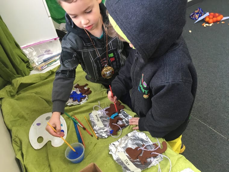 Both classes spent the first half of the week making some deliciously good smelling gifts! We added cloves to an orange and made a quick and easy potpourri ball, then we added cinnamon, applesauce glue and cloves to make a concoction that felt like playdough and looked like mud! We even added some ‘ground’ cloves. We professionally ground them with our boots! After shaping them, into the oven they went! After baking for a few hours, we had the entire downstairs of Irvine smelling like a giant cookie! Even staff members were inquiring about the mystery scent. We shaped them into ornaments and had the chance to paint them and take them home!