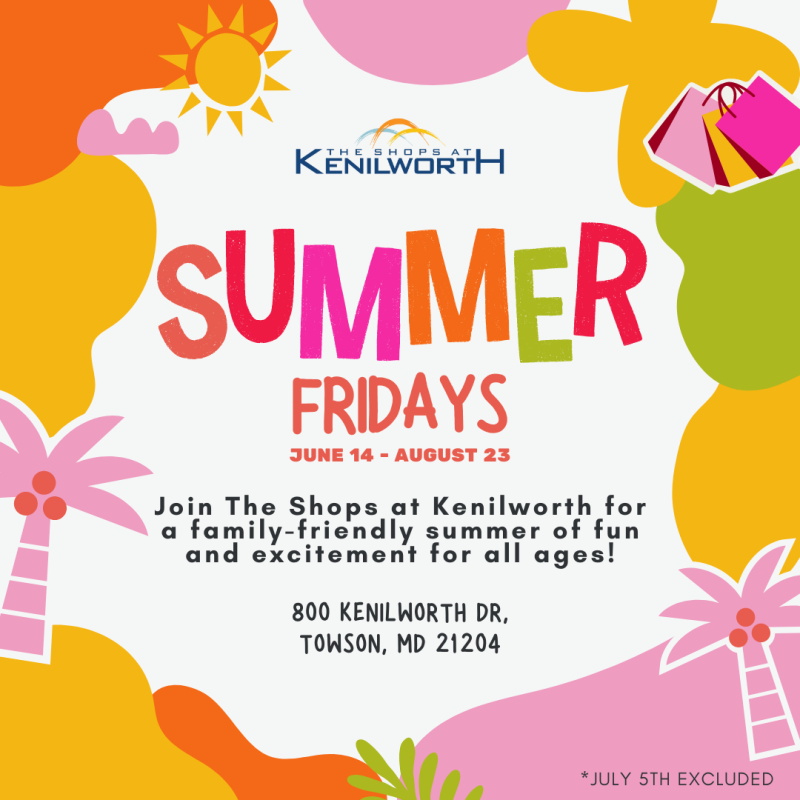 Join Irvine Nature Center at The Shops at Kenilworth in Towson, Maryland for Summer Fridays, a family-friendly summer of fun and excitement for all ages! Attending guests will gain access to exclusive deals from select businesses at The Shops at Kenilworth!