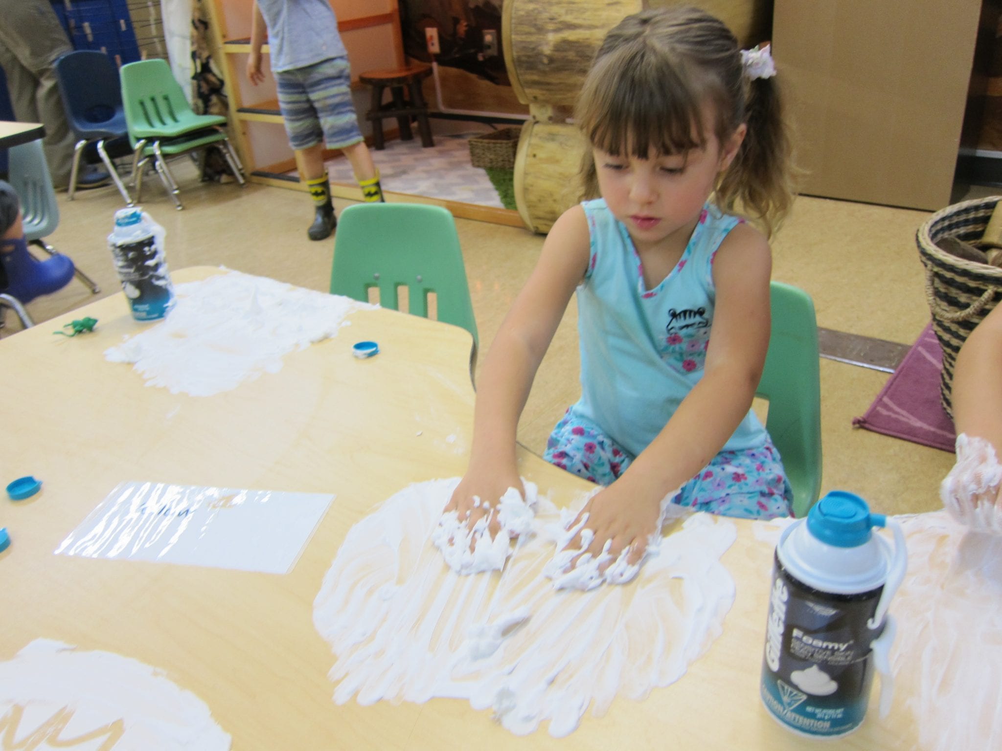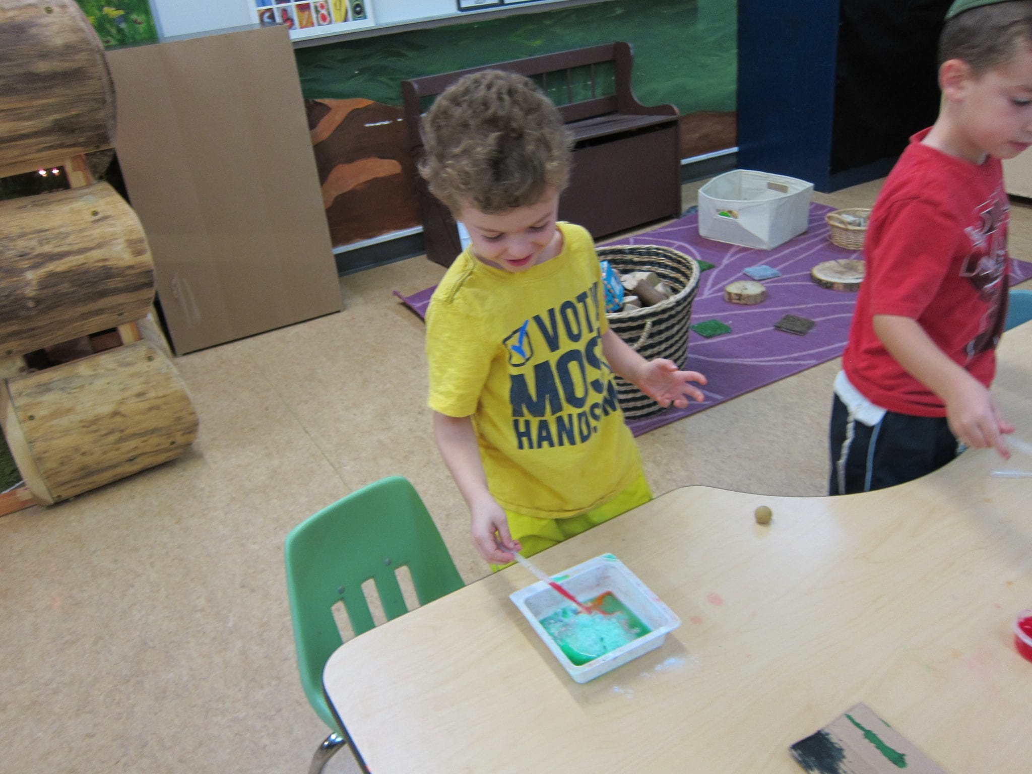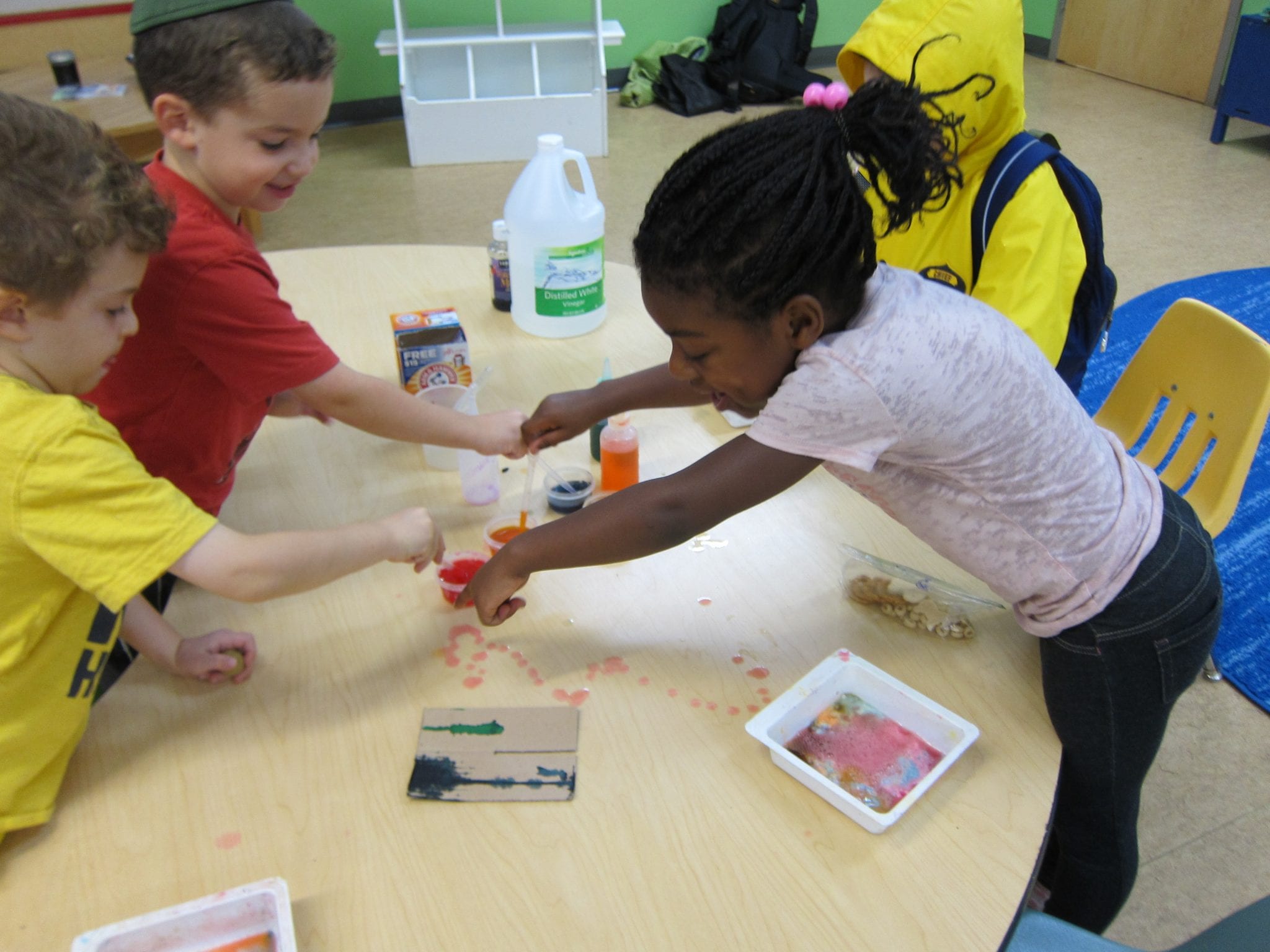 On Monday, we took to the indoor Preschool classroom for a little fizzy fun. We noticed that adding blue vinegar (rain) to our baking soda (mountain?) it made a nice little rainy soothing sound. Everyone was very surprised and excited to see the chemical reaction! Our story for the day was Mouse Count by Ellen Stoll Walsh. We learned about telling stories with props and we even made our own props to go home and re- tell the story with. Rope became a ‘snake’ and cotton balls became the ‘mice’ of the story! We even got to take them home in a handy dandy jar!