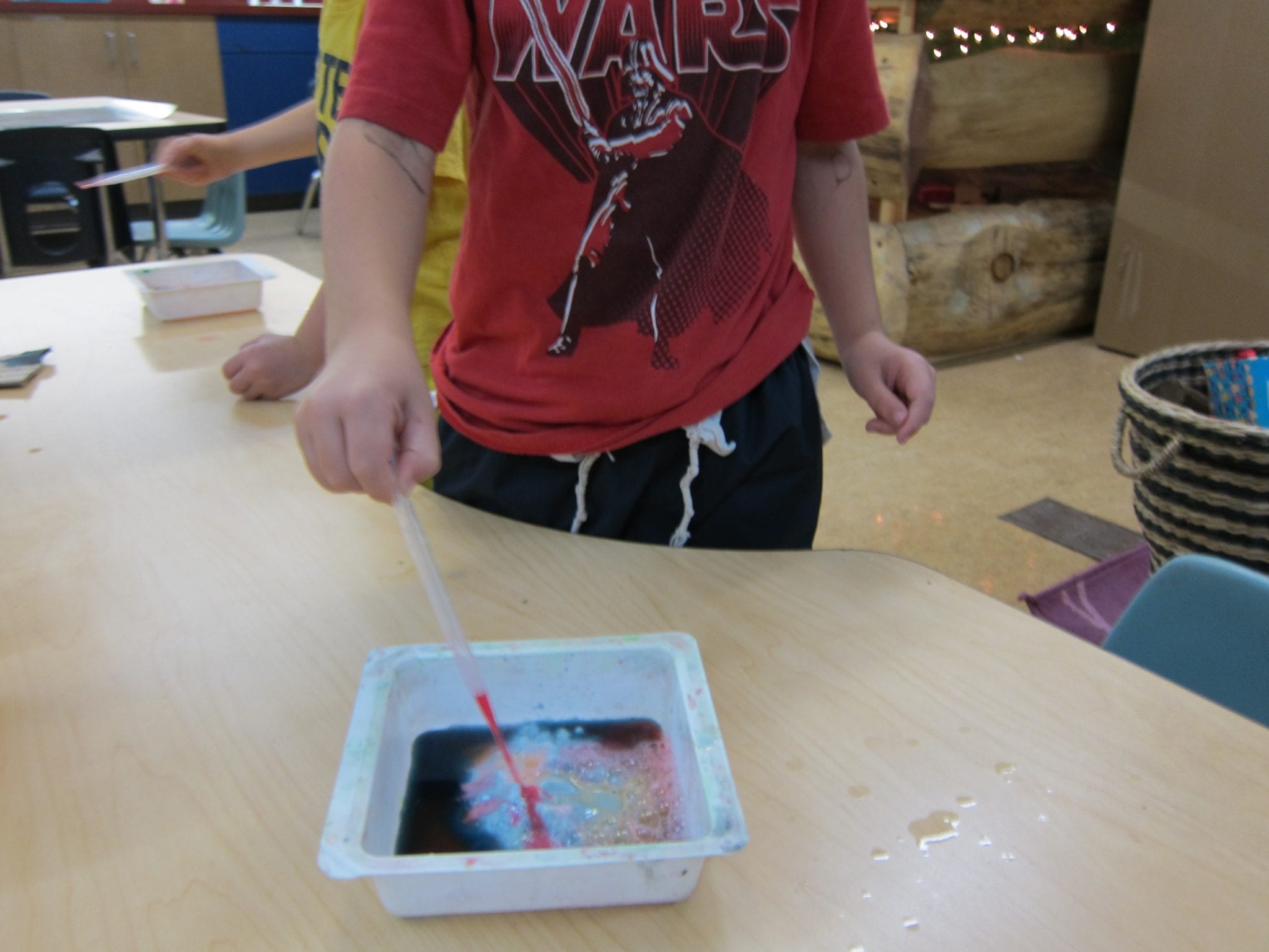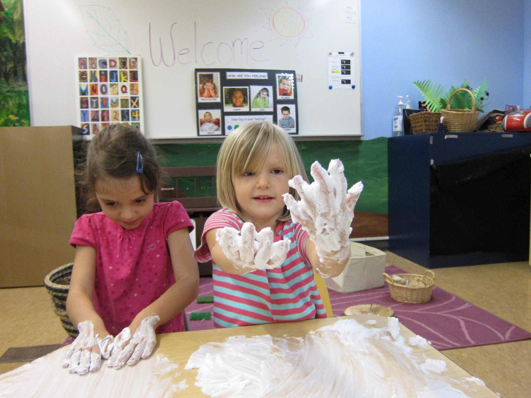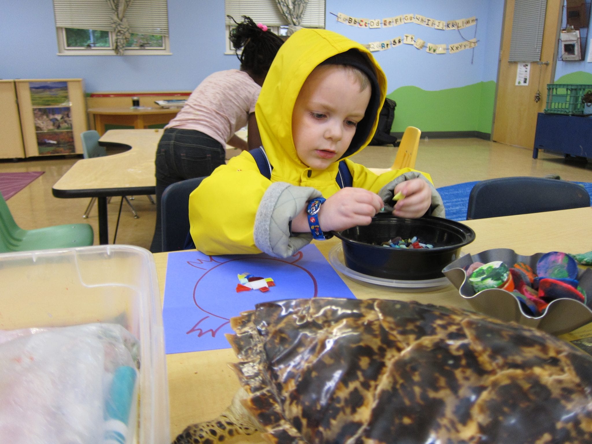 On Monday, we took to the indoor Preschool classroom for a little fizzy fun. We noticed that adding blue vinegar (rain) to our baking soda (mountain?) it made a nice little rainy soothing sound. Everyone was very surprised and excited to see the chemical reaction! Our story for the day was Mouse Count by Ellen Stoll Walsh. We learned about telling stories with props and we even made our own props to go home and re- tell the story with. Rope became a ‘snake’ and cotton balls became the ‘mice’ of the story! We even got to take them home in a handy dandy jar!