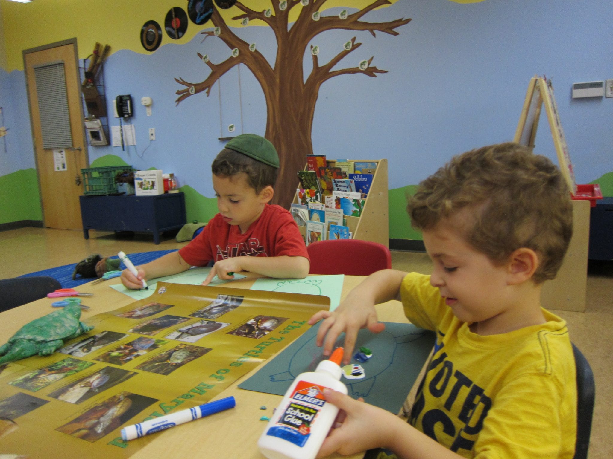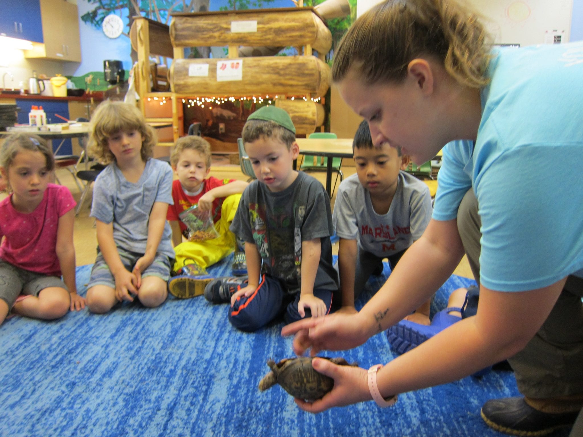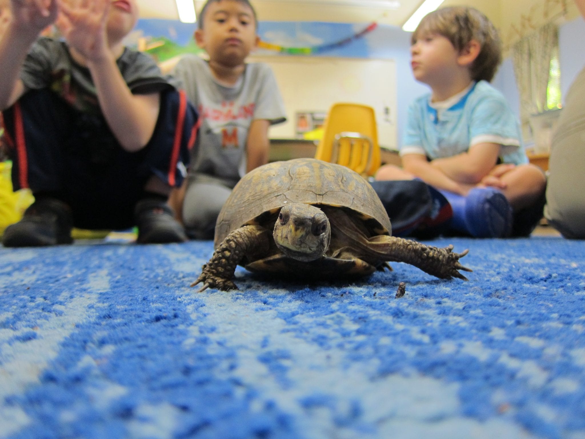 Miss Ellen joined us for the day while Ms. Tara was at a professional development and she brought us a fun friend- a really neat box turtle! We learned why its called a box turtle (because it can fold up the bottom of its shell when it wants to hide) and we took a look at its coloring and noticed it had perfect coloring on its shell/body to hide in the fall. With fall thoughts in mind, we officially I.D’d our first leaf- the tulip poplar. It’s pretty easy to identify because they have the shape of a kitty cats face… oh yeah, and they are EVERYWHERE around Irvine! We thought it was funny to step on the fallen leaves and pretend they were meowing back at us!