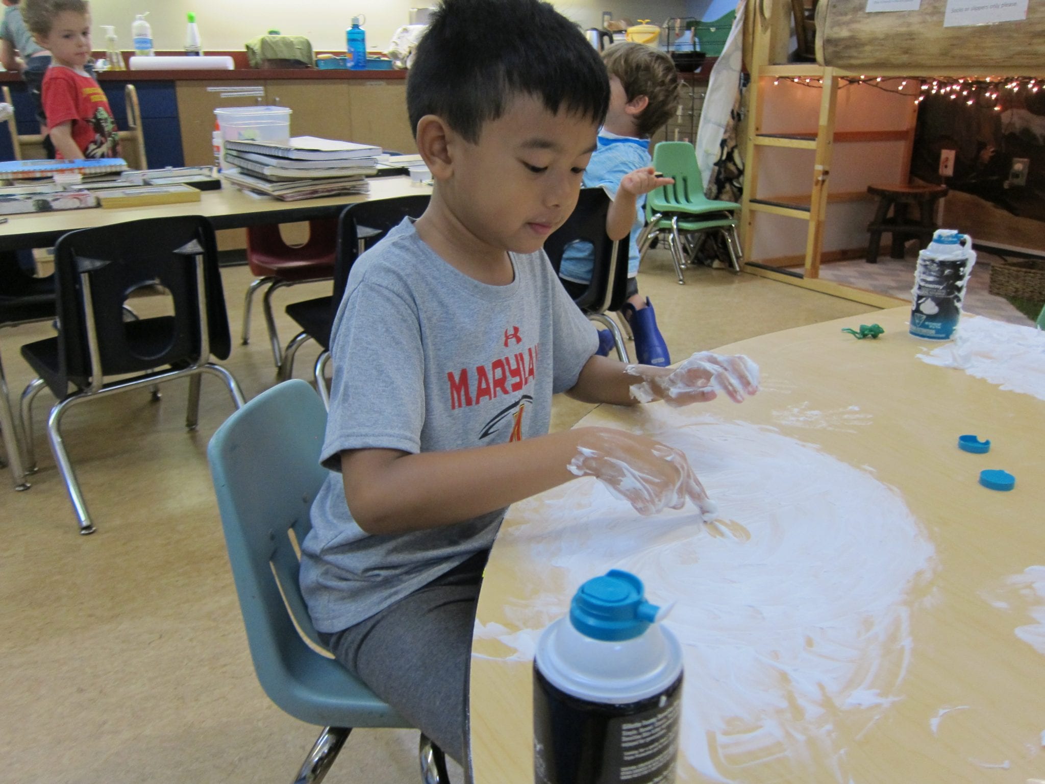 Another day of some indoor space fun was had on Tuesday. We practiced our letters and writing words in shaving cream! The greatest part was, once we were done, we were already clean!