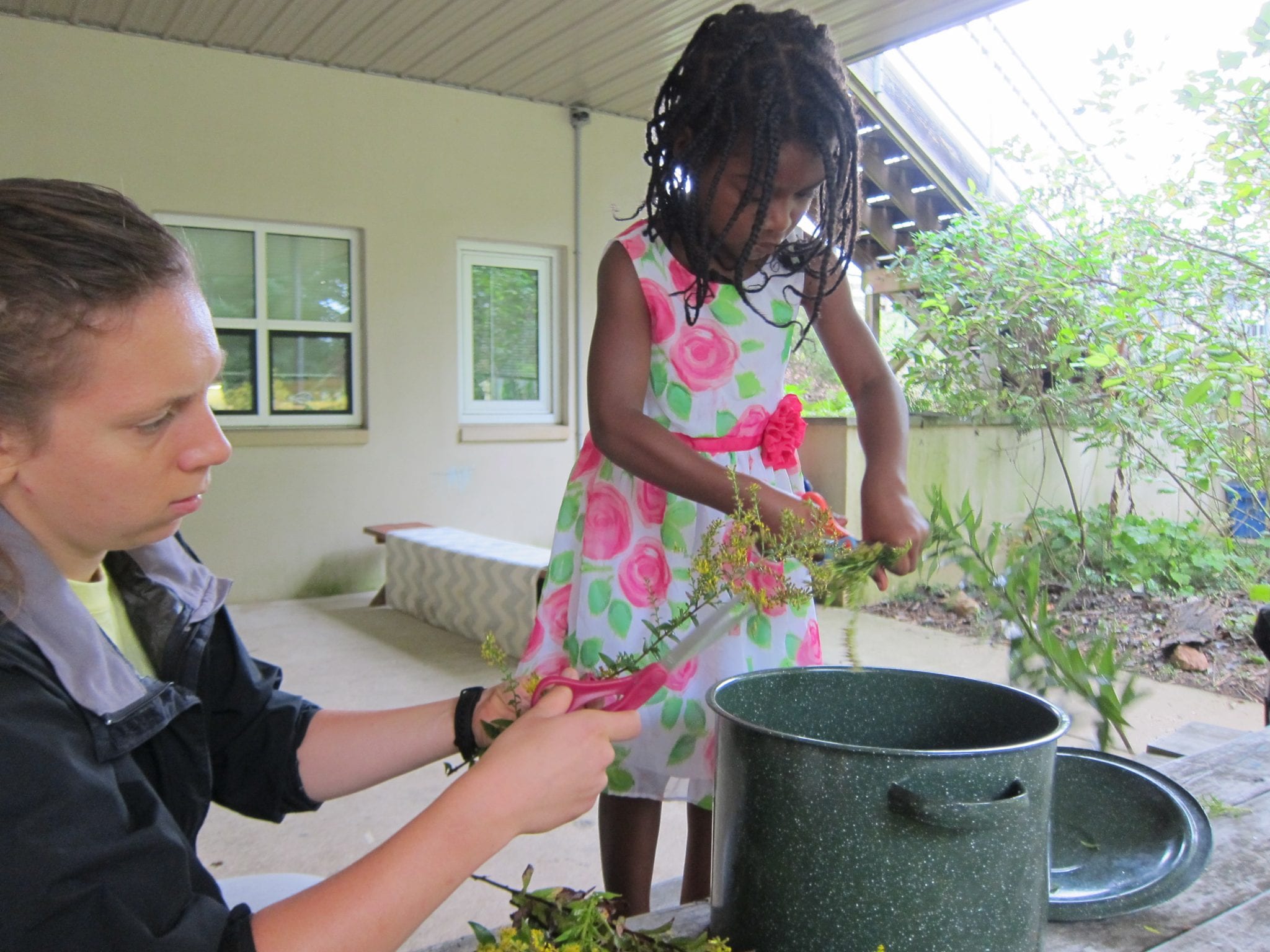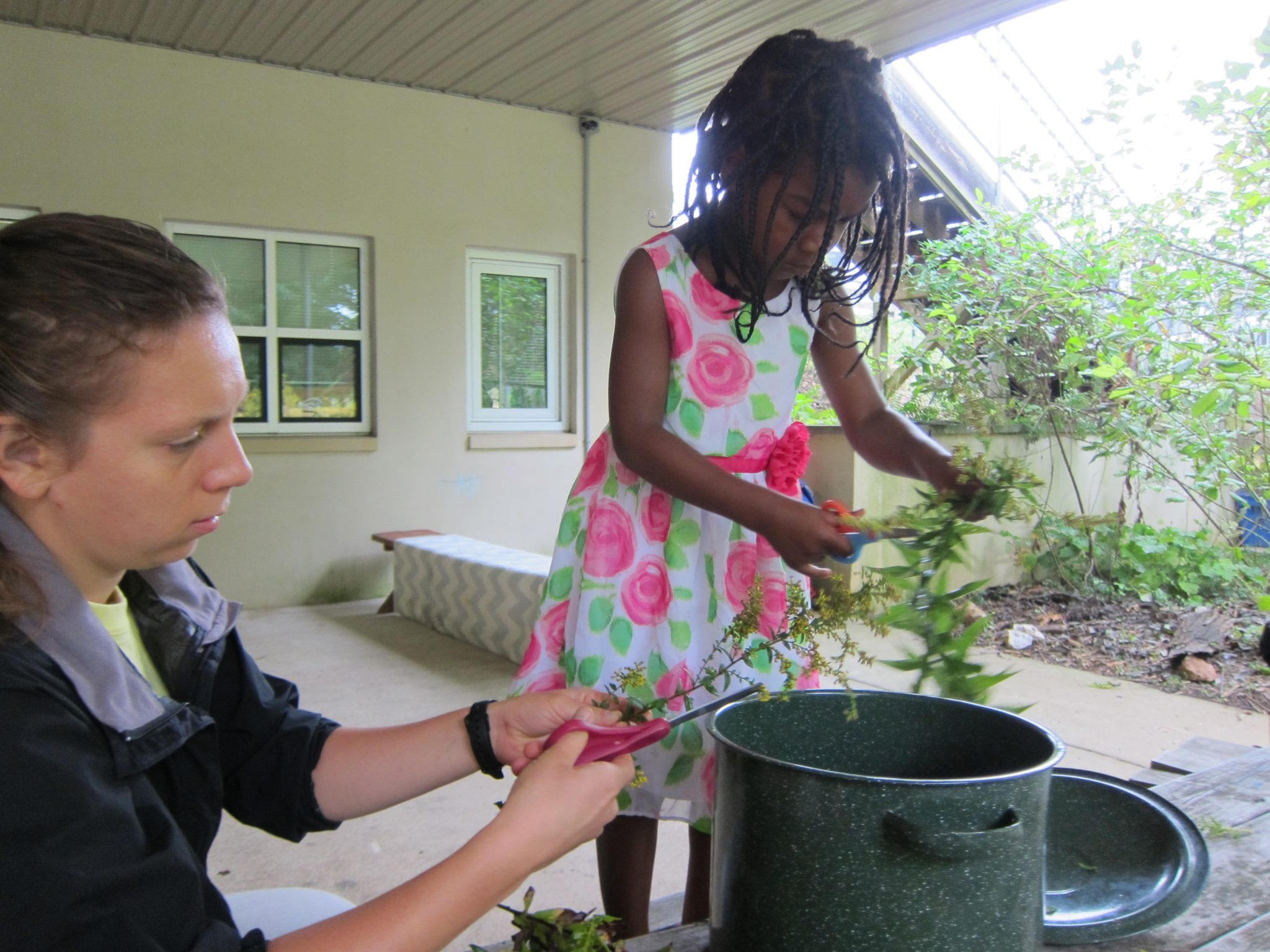 On Wednesday, things at Irvine looked a little different! Instead of a parking lot, there was a giant tent enclosing our parking spaces. We took some time to watch all of the workers busily getting ready for a big fundraiser! We collected some goldenrod from the edges of the sidewalks around the building and began our process of creating yellow dye. Here’s how we did it-
