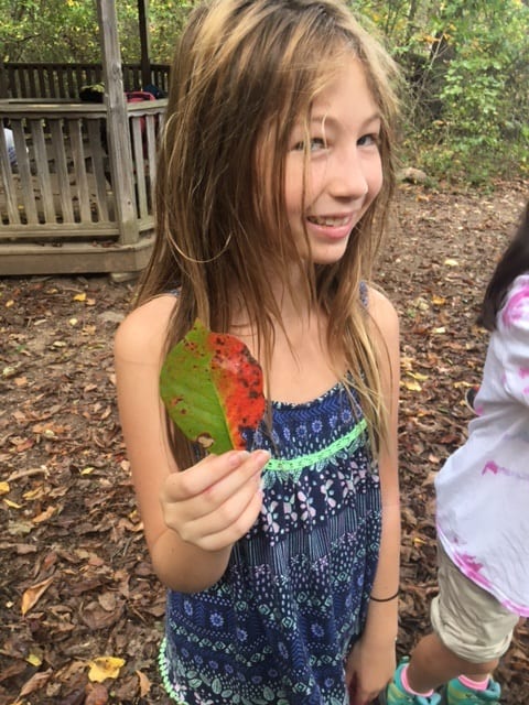 Today was all about using our nature engineering skills to build a dam and discover the best materials for dam building and put ourselves in the mind of a beaver. We started our afternoon by revealing our chlorophyll experiment from the previous week. We had collected leaves of different colors, torn them up into tiny pieces, put them in a cup with rubbing alcohol and a coffee filter and waited. The results are nature’s tie-dye with chlorophyll and other leaf pigments. We each got a piece of a coffee filter painted with leaf colors, put it in our journal and labeled the pigments. Green pigments are called chlorophyll and are created by chloroplasts in the leaf. As Fall and Winter approach the chloroplasts begin to shut down and die, no longer creating green chlorophyll. When this happens, other pigments that exists all along start to come to the forefront. The yellows are called flavonoids, the oranges are called carotenoids and the reds are called anthocyanins. It was also really neat how the different pigments layered themselves in the coffee filter.