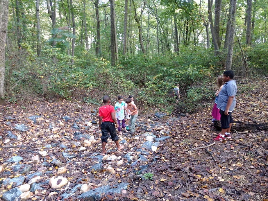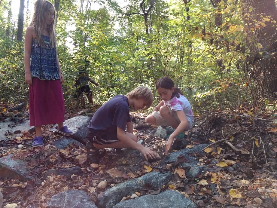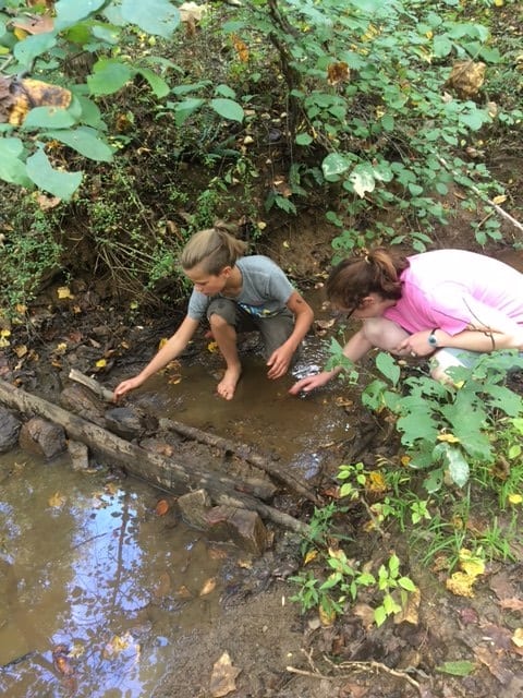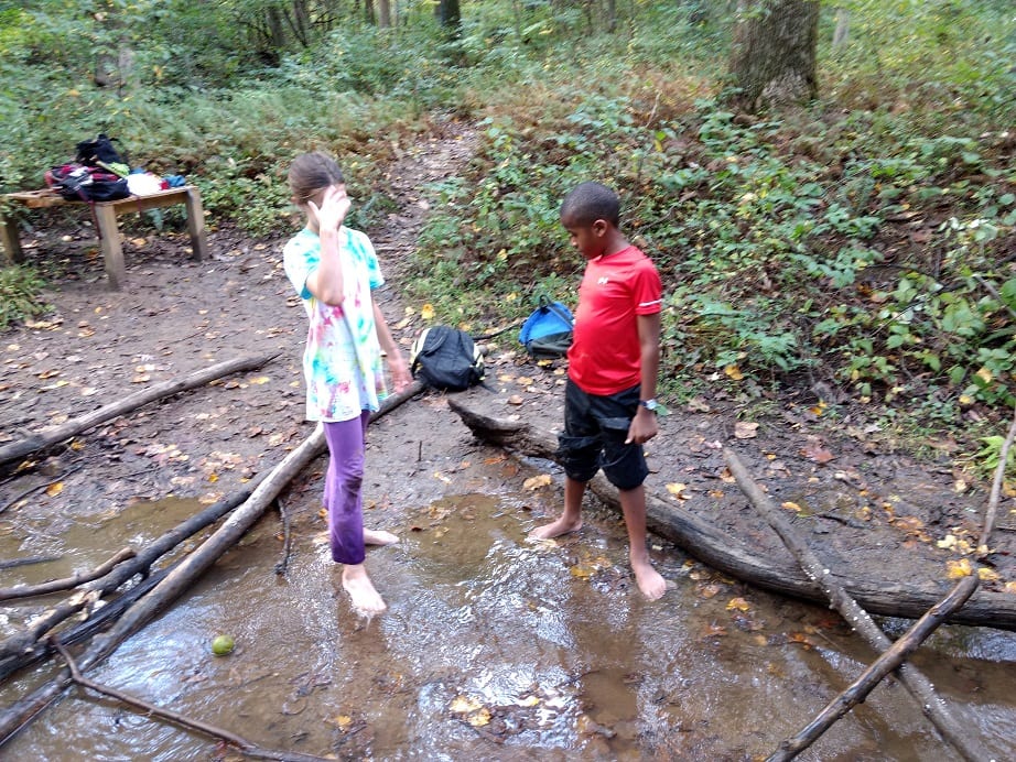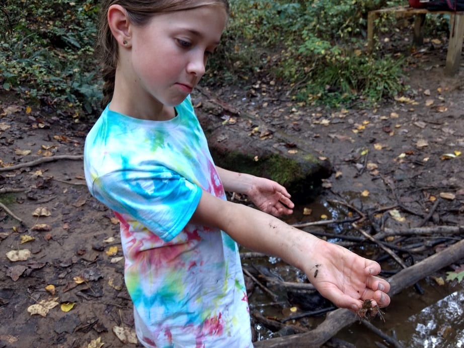 On our way to the stream we had a great time creating a leaf market using nuts like acorns and hickory as currency to purchase leaves. I’m not sure who created the market but I do know that Audrey and Noa were the first ones to start it. It became a really fun game that the kids later named “The Green Market.” They all decided that an acorn = $1 and with a cap that acorn is worth $1.25. Just an acorn cap is $0.25. A hickory nut with no shell (husk) is $0.50 and a hickory nut with a shell (husk) is $0.75. It looks like those acorns are more valuable! You can see a picture of their currency they wrote down below in the gallery. Also near the gazebo we found a very large wholly bear caterpillar and counted the rings on the fallen oak tree. We briefly talked about why a tree makes rings and the different parts of a tree. The parts include the heartwood in the center, which is wood that isn’t alive but provides structure and support, the cambium, which is alive and is a very thin layer between the heartwood and the bark and then the bark itself which provides protection. We found out that oak tree was nearly 60 years old!
