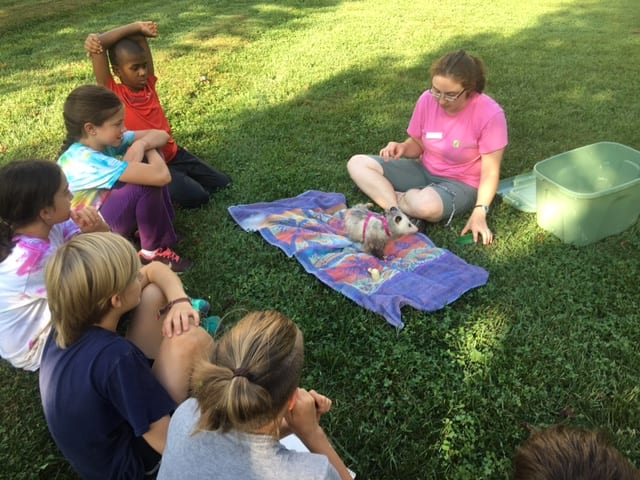 We explored the new part of the stream and moved some smaller rocks around to experiment with the flow of the water and listened as the water rushed far under the rocks. We found more frogs and a couple crayfish, one was a tiny baby crayfish. We spent some time exploring the restored part of the creek before heading back to Irvine to meet a nocturnal mammal. Gathering on the grass we met our Virginia Opossum. Opossums are nocturnal marsupials that are native to Maryland. Some of their great features are they eat ticks and they eat a lot of them too! They also can play dead when they feel threatened and have a very useful prehensile tail which aids them in balance and grip and if they slip off a tree they’re climbing. Opossums, however, don’t use their tail to hang upside down and sleep. That would be like you hanging by your pinky fingers, ouch! We talked about where opossums live, what they eat and some of their adaptations, such as their great hearing, large whiskers and dark eyes to see at night. The opossum got a few grapes and grape tomatoes as a yummy treat for being such a great animal ambassador for us today!
