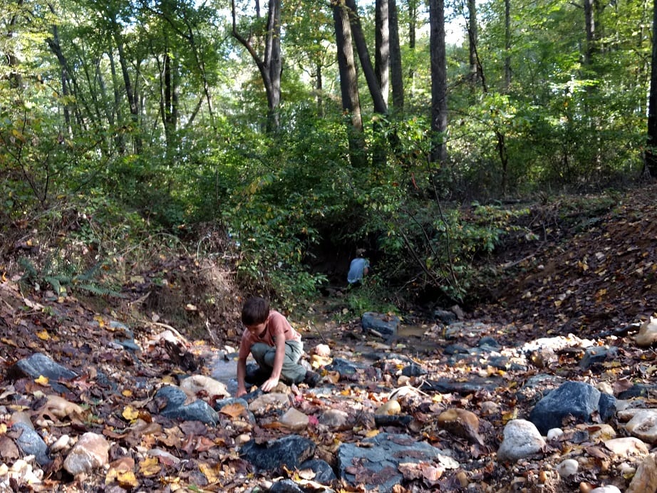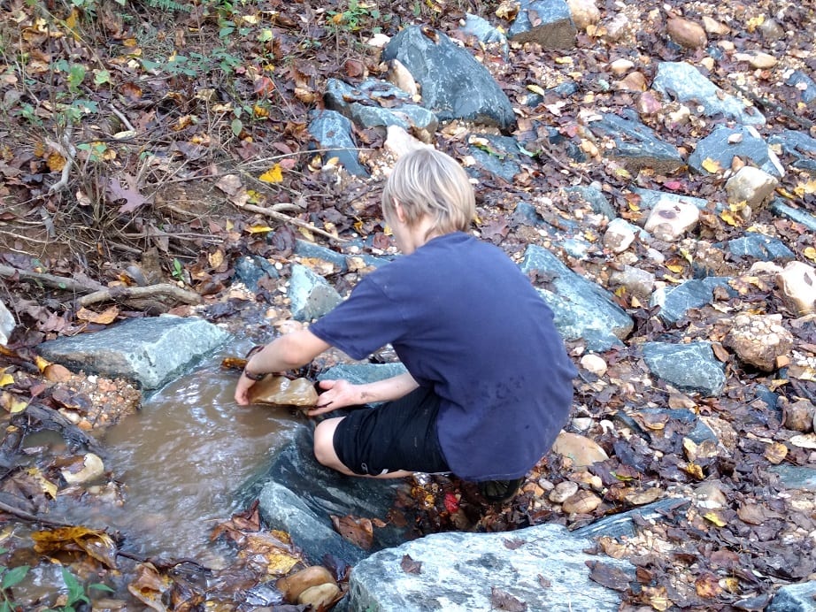 - Lev looking at the water moving through the rocks