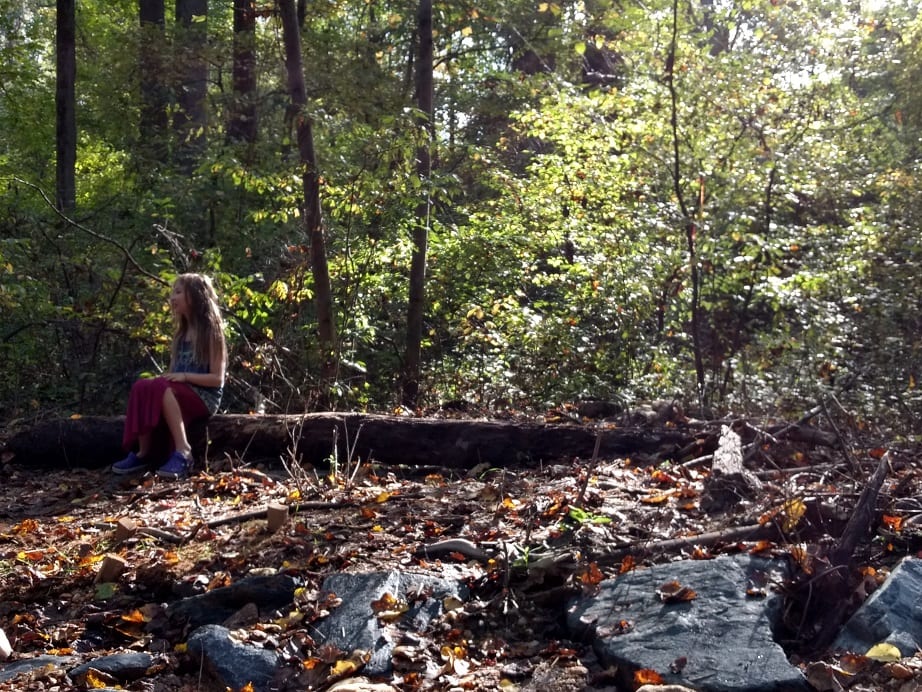 - Audrey resting on a log