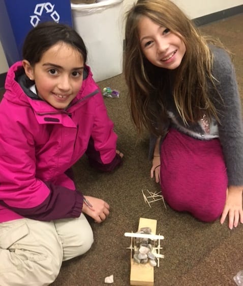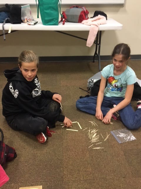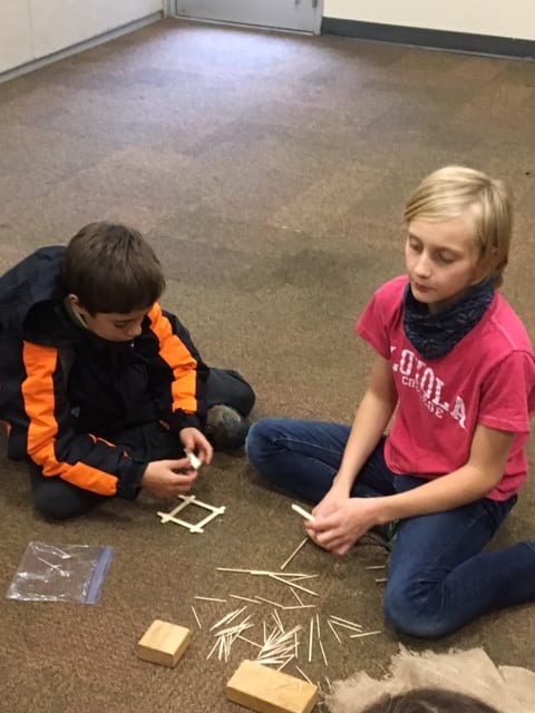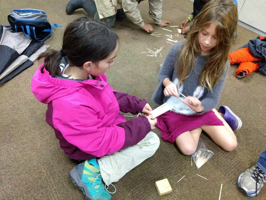 It was a very rainy, cold day today as we learned more about echolocation and finished a project we didn’t get to work on during our lesson on spider silk inspiring technology. Spider silk is one of the strongest materials built by a living thing in nature. By comparison, if you were to have a steel cable made the same thickness of spider silk, the spider silk would be 5 times stronger! Humans have yet to develop a material that matches the same strength as spider silk. We started the day inside as we watched the rain pour down outside. After dividing into teams of two we discussed the activity. Because the bridges we were building were going to be small since our materials were 50 toothpicks, 8 small skewers, 6 small popsicle sticks and 4 five inch long strips of masking tape, we needed to work in smaller groups. Working in groups is also a great skill to develop, it helps with problem solving, communication and compromise. It also allows kids to express ideas and thoughts and alter projects with a teammate. Once our bridges were constructed we planned to place rocks on top to see how much weight they could hold. None of us anticipated the strength of the bridges! In fact, Elias and Solace built a bridge so strong it held the weight of a kid standing on it elevated on blocks (James and Eva’s bridge also held the weight of a kid!). They made sure their foot was not touching the wood blocks either. It didn’t start to crack until the 4th kid had taken a turn testing the strength of the bridge (the bridge is pictured below with the rock stack). We also looked around and noticed the different designs people had come up with. Some bridges were built with design in mind and not so much strength, others were built with pure strength in mind and didn’t offer as much in visual design. Some were very engineered and used weaving. Engineering, even in small forms, is a great pathway towards creativity and discovery.