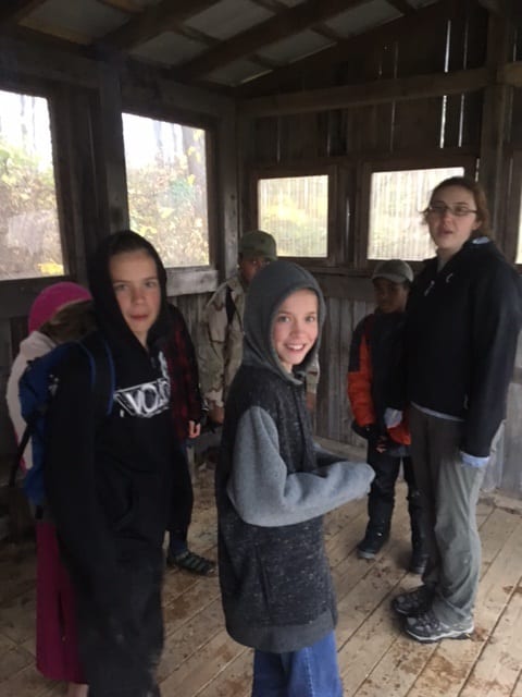 After some bridge building, we bundled up and headed outside. We hiked through the forest, listening and watching the rain fall through the trees, many of which are missing their leaves and providing little natural shelter. We stopped at the gazebo for a break from the rain and to play a game to help us with communication since we were starting to learn more about echolocation. What is echolocation exactly? Echolocation is used by a variety of animals such as bats, dolphins and even cave dwelling swifts (birds) to find their food and to move throughout their environment. Echolocation is a series of sound waves sent out into an environment and when those sound waves bounce back off an object the animal that sent out the sound waves can tell relatively what the object is and how far away it is. Humans have learned from animals and developed our own form of echolocation called sonar (in water) and radar (in air) to help with exploring the depths of the ocean and navigation both above and below water. The game we played in the gazebo is called Telephone. There are two ways to play (thanks James for sharing a new way, it was awesome!). One person thinks of a phrase or action and whispers it to the person next to them. That person whispers it to the person next to them and so on as you travel around the circle (you can only whisper it once!). Once it gets to the last person before the person who thought of the phrase or action they either say the phrase out loud or act out the action. Usually what happens is some words get messed up along the way or the phrase changes entirely! We also played the game (to give everyone a turn) down at the Ed Hut, which was much harder with the rain pounding on the metal roof.