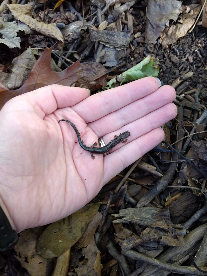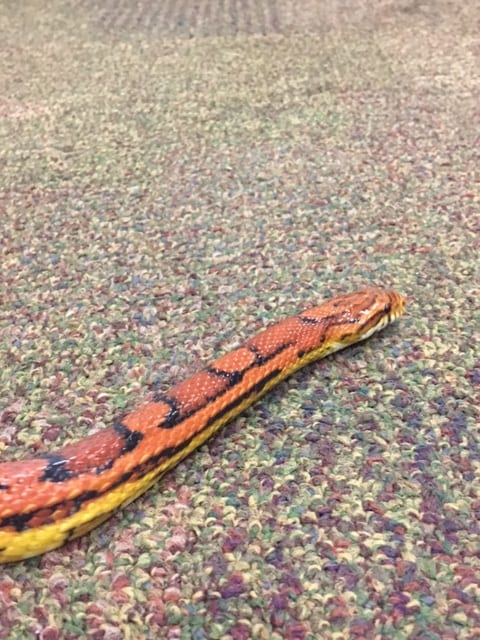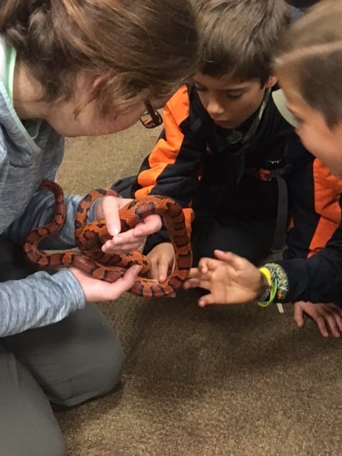 Back at Irvine we got to meet an animal ambassador as we warmed up inside. The animal we got to meet was a male corn snake. Snakes are very beneficial animals and unfortunately suffer from bad reputations. All of the snakes that live at Irvine are nonvenomous. In Maryland we only have two venomous snakes, the Copperhead and the Timber Rattlesnake. Neither you really have to worry about because the Copperhead is relatively non aggressive and only found in specific habitats in Maryland and the Timber Rattlesnake is found exclusively in Western Maryland and is seeing a decrease in their numbers, sadly. Snakes have many helpful characteristics. First they love to eat mice and rats, both of which are carriers of diseases and other parasites like ticks. Snakes also provide a balance to the ecosystems they live in, keeping prey animals in check and even feeding other predators like hawks. Snakes have some pretty cool features, too. They have a rather unique way of smelling their environment. They use their tongue to pick up scent molecules which they then put into an organ in their mouth called the Jacobson’s organ, which resembles a nose. Snakes also have the ability to dislocate their jaw in two places, the jaw itself (attached to the skull) and the lower jaw can open in the center into two pieces to swallow large prey. We talked about the cool features of a snake and got a chance to touch the snake too! I’m sure that our snake was very happy to be in a comfortable home on such a cold, wet day (snakes are cold blooded after all!)