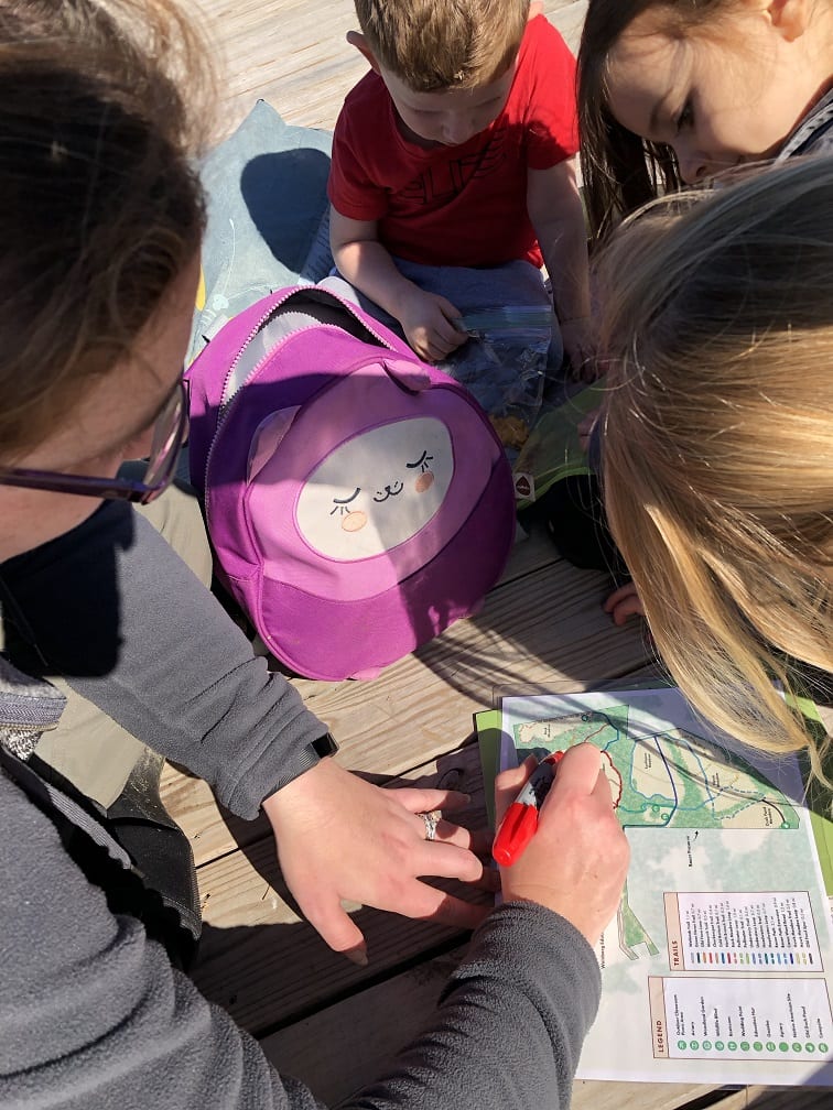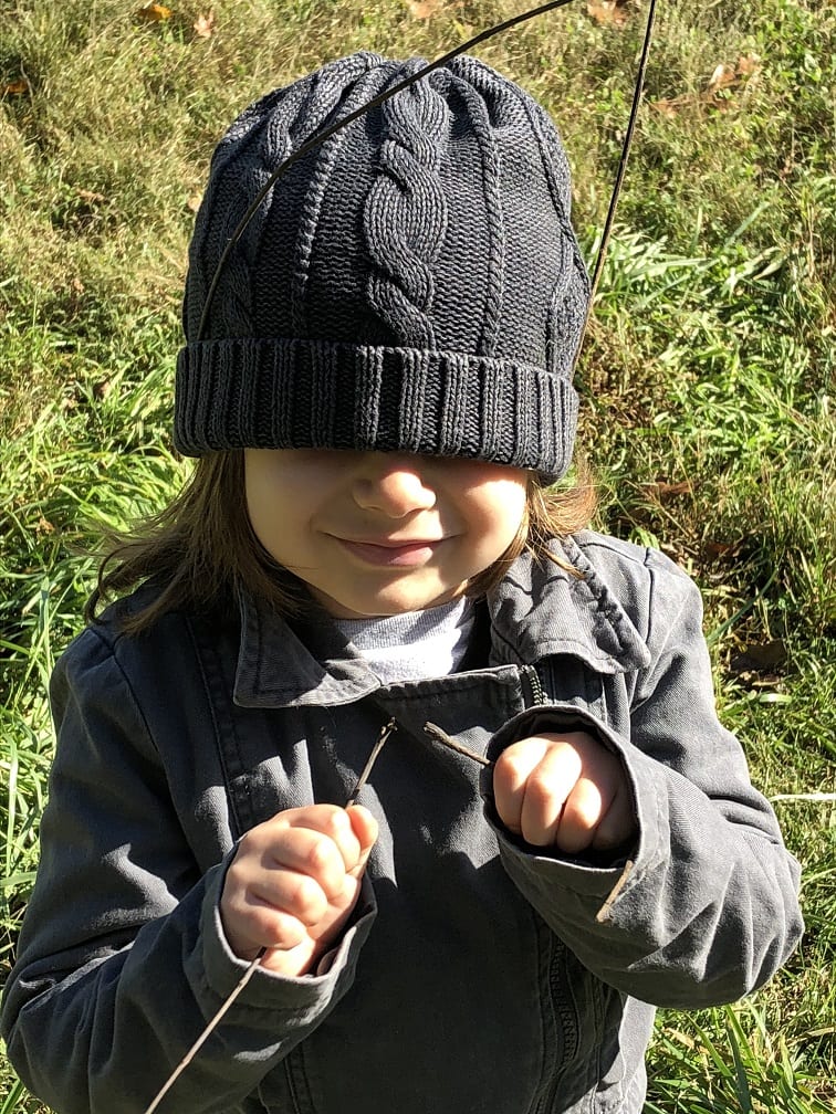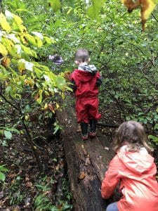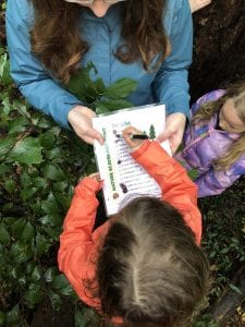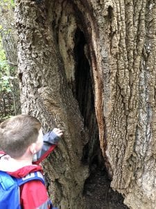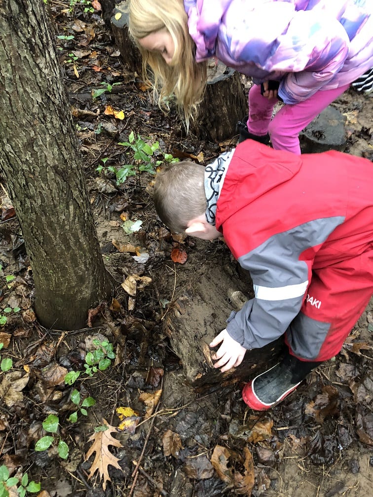 After rolling over every log, we set off to work on our Nature Scavenger Hunt. We were searching for a tree without brown bark when we came upon the seven-trunk sycamore! The kids quickly scurried into the “nest” where they were overcome with the number of slugs inside. As they started to count them down, one of our friends declared there were 20 slugs in the tree. I am not sure if there were really 20 but they were numerous with trails of slime following behind.  Ms. Kelly explained to the kids if they hummed to the slugs, their tentacles would come out.  As we were heading back to the outdoor classroom, we noticed one of our friends humming to a lone slug 🙂