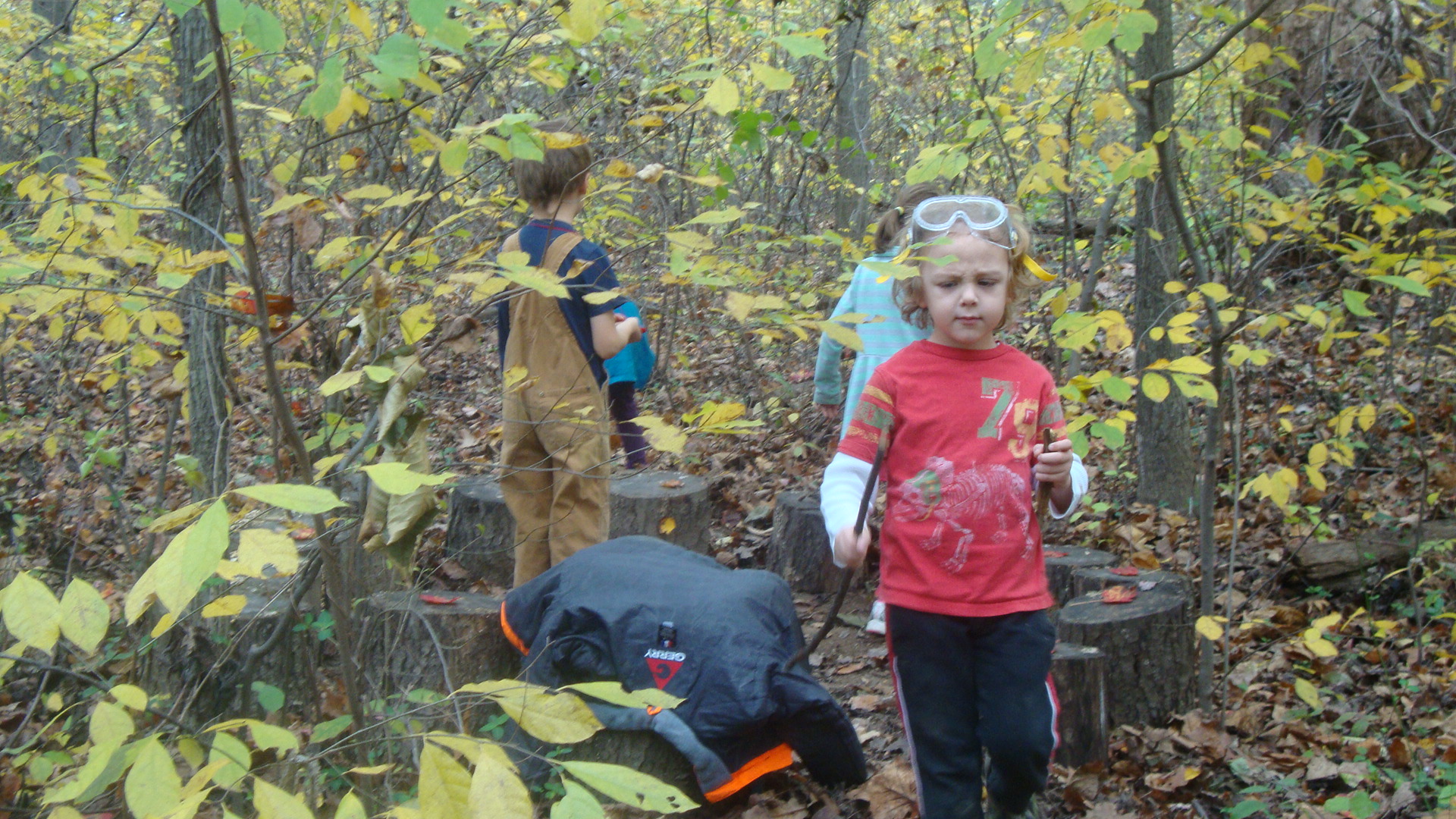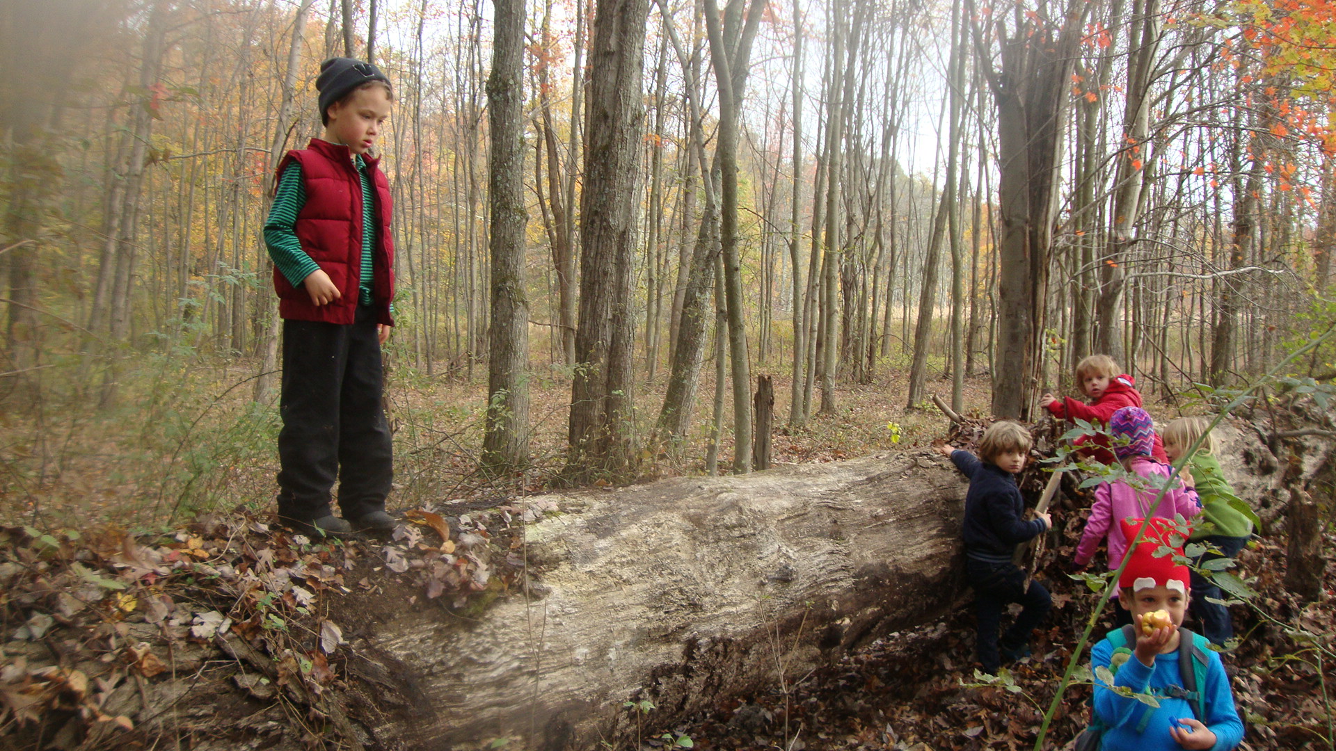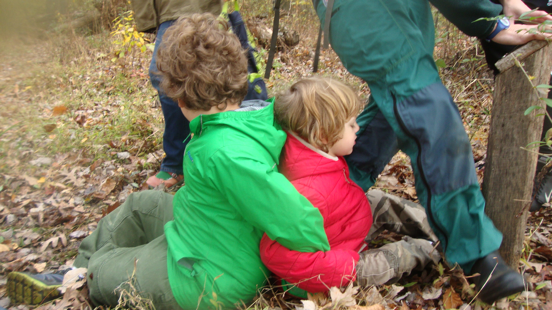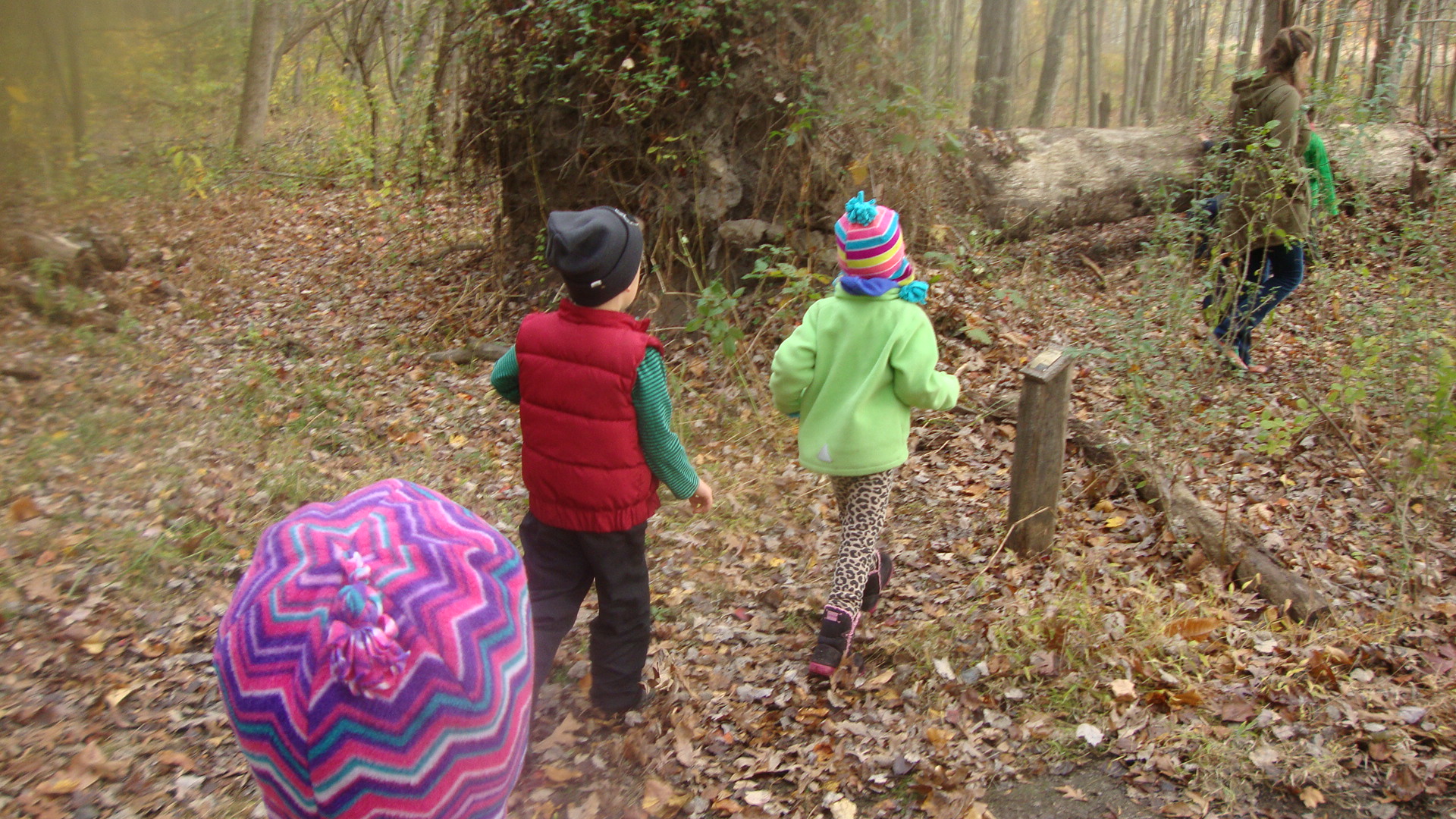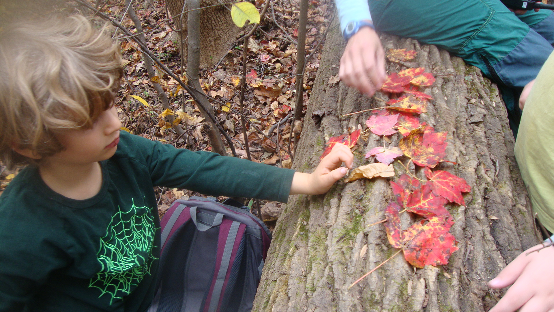 Our travels took us to a new favorite spot- the hidden ‘fairy circle’. The class stumbled upon it sometime in the past weeks, and now ask to go there every time we walk by it! It provides a little nook that is off trail for the kids to explore, build, balance and dig! This time, we found these beautiful bright red and yellow maple leaves. We enjoyed collecting these leaves and observing their fiery colors.