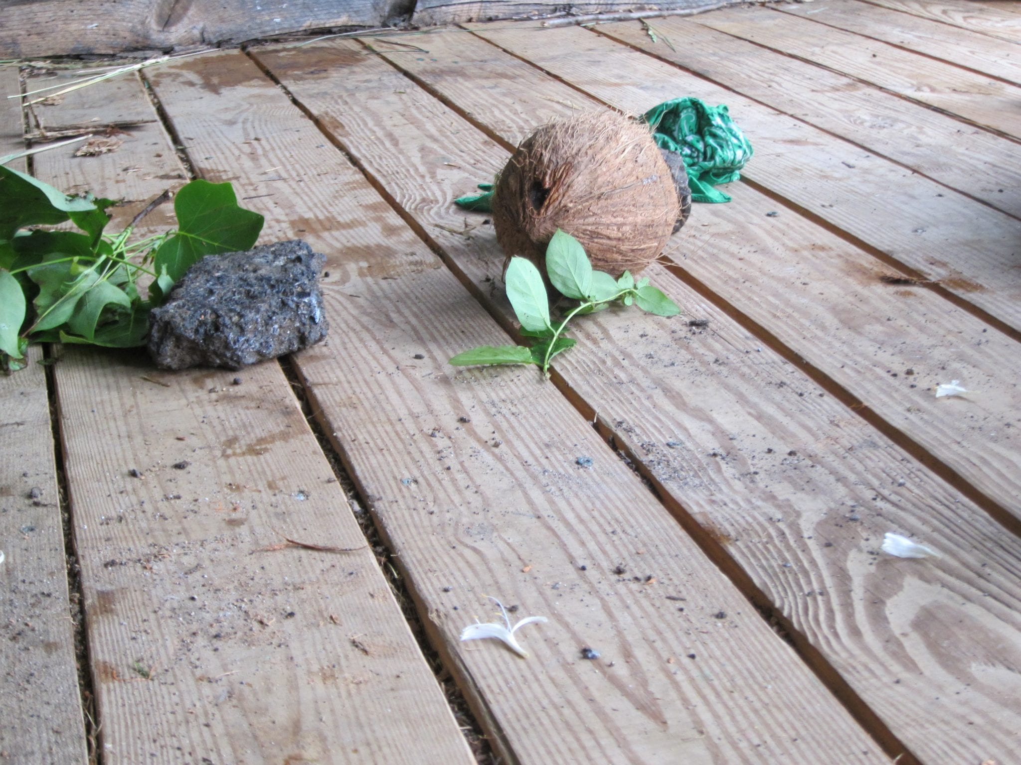 We realized that we didn’t have a knife, or blender, or hammer with us, and that busting it on a hard surface would cause the water to be lost. Ms. Sophie found a screw on the ground in the Ed Hut and we thought it would be a perfect point to use on the hard coconut shell. We started with a large branch as a hammer but found it too awkward to swing. We ended up with a heavy rock with a flat side. Worked like a charm!