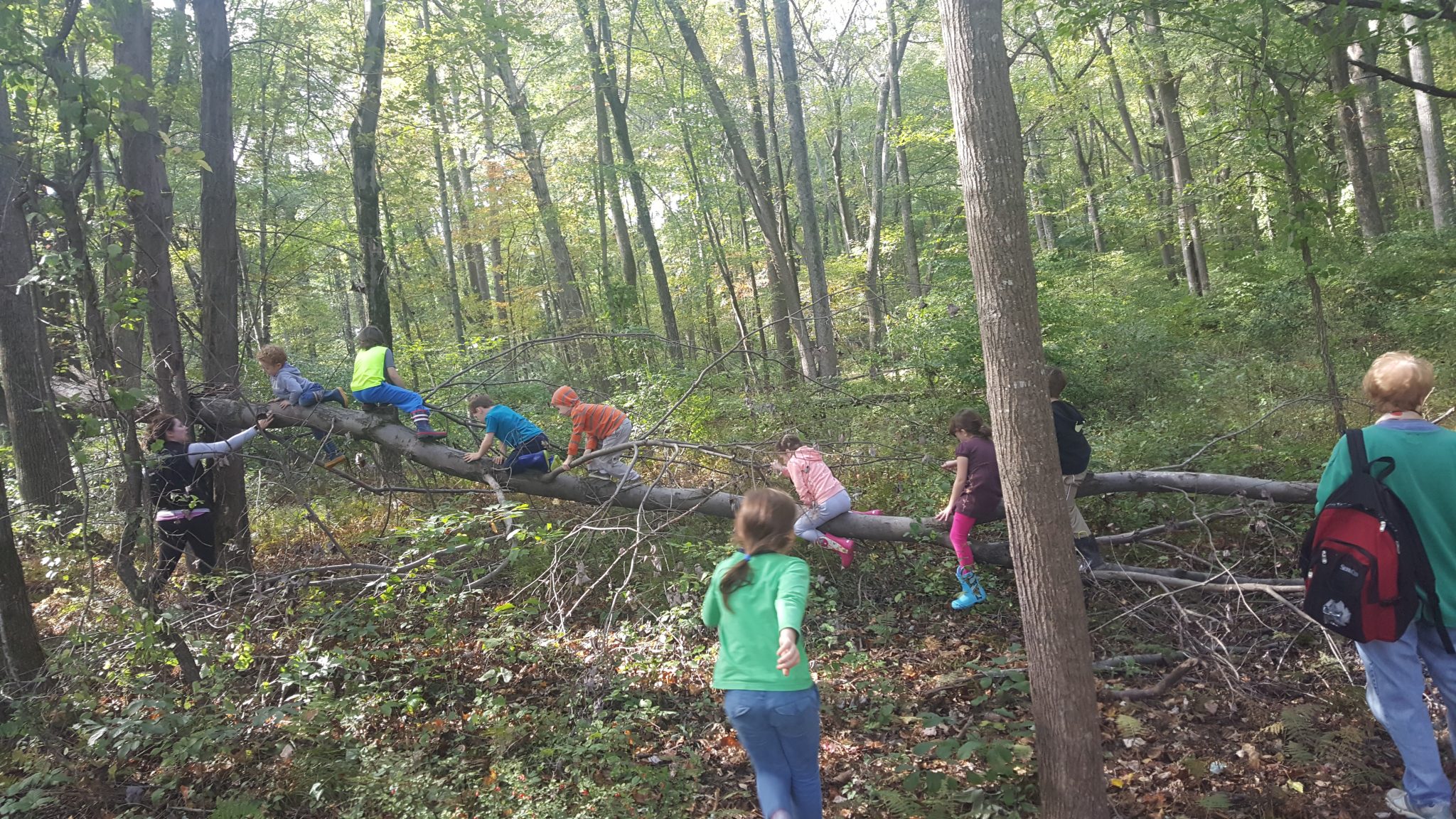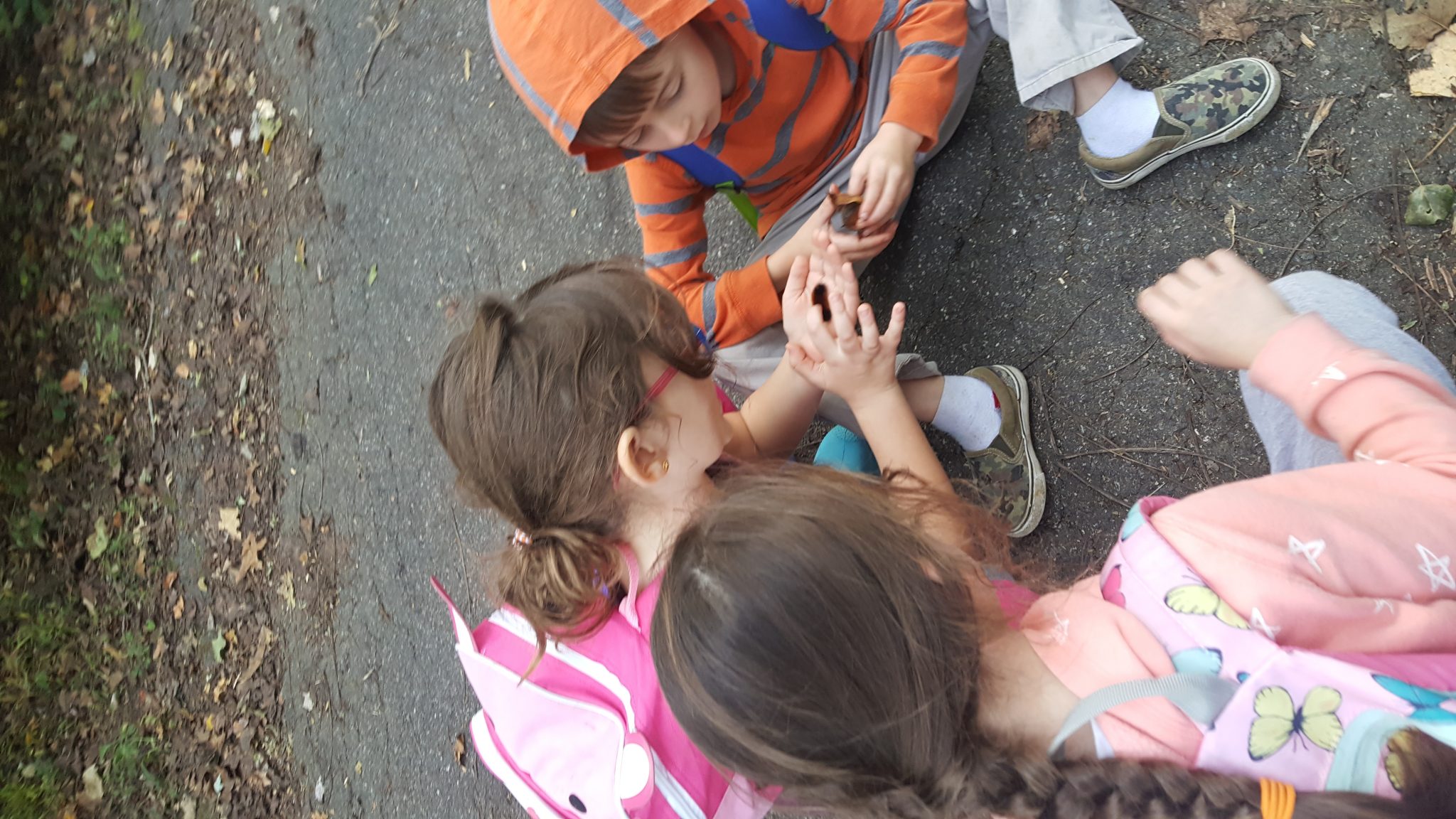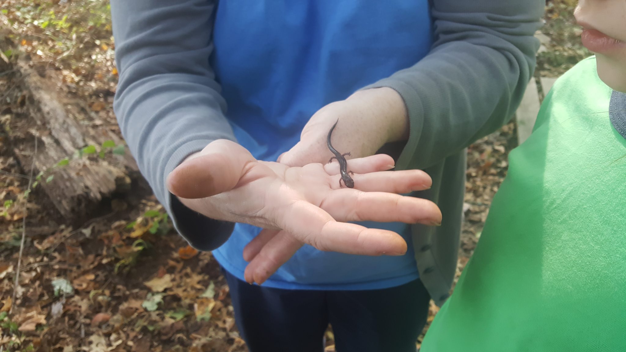 Once in the woods we had some freeplay/exploration time. I love watching kids play in the woods when there are no instructions. Some of the things that naturally occurred included tree climbing, tree balancing, imaginative play, building with natural materials, and checking out the red-backed salamanders (Plethodon cinereus) that Ms. Colleen helped us find! We even found both color variants, the red striped one and the darker one known as lead backed!