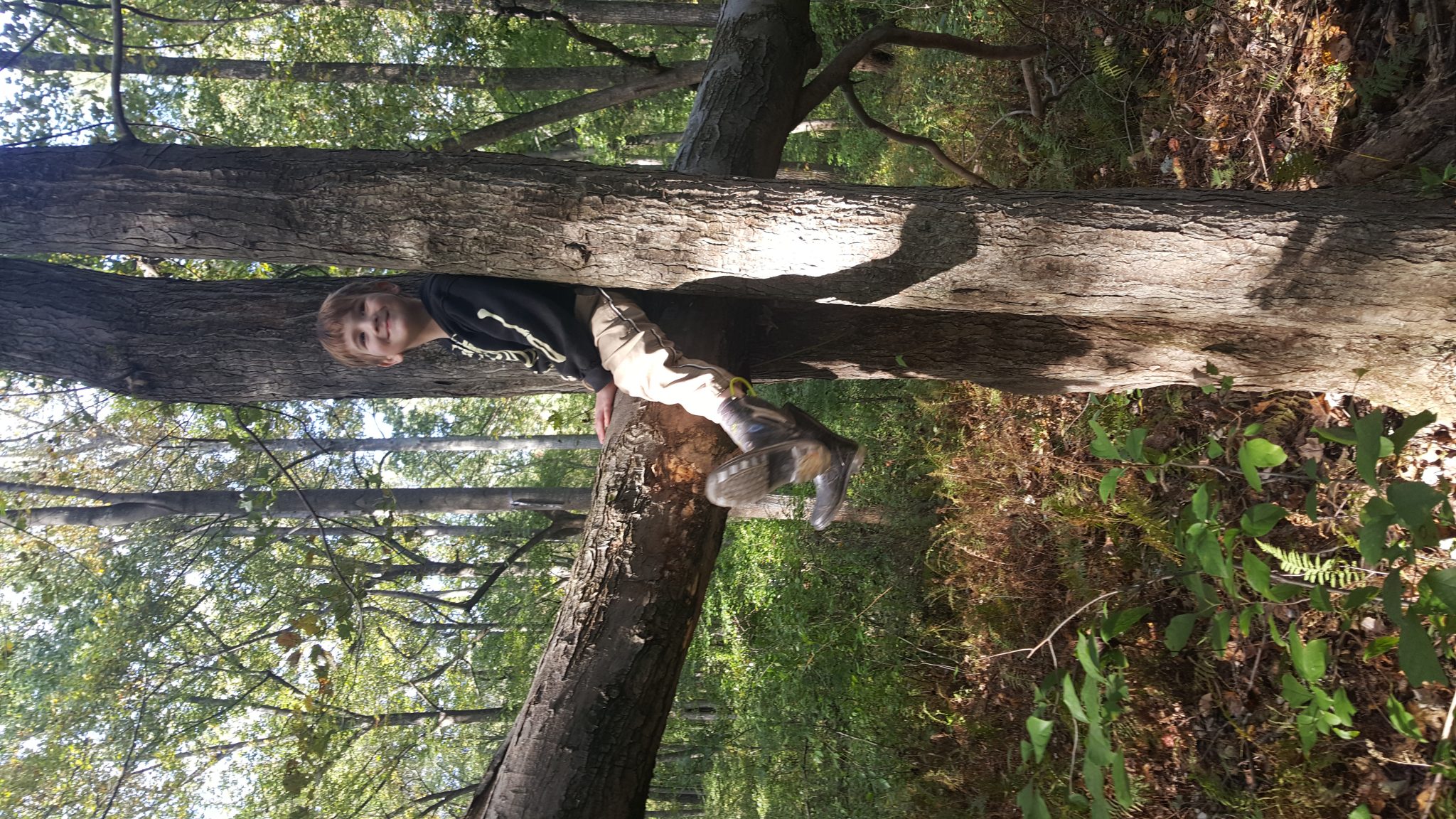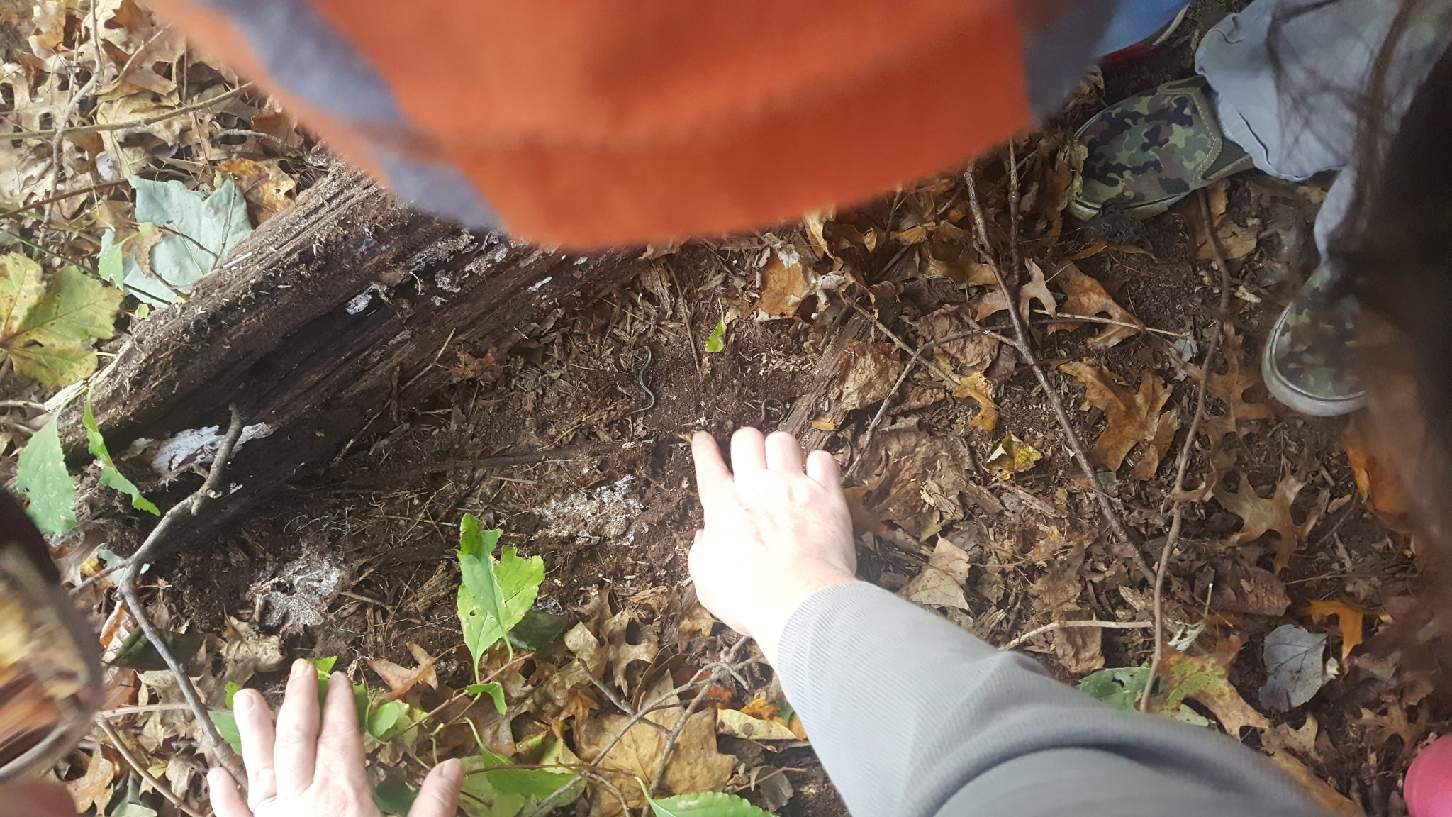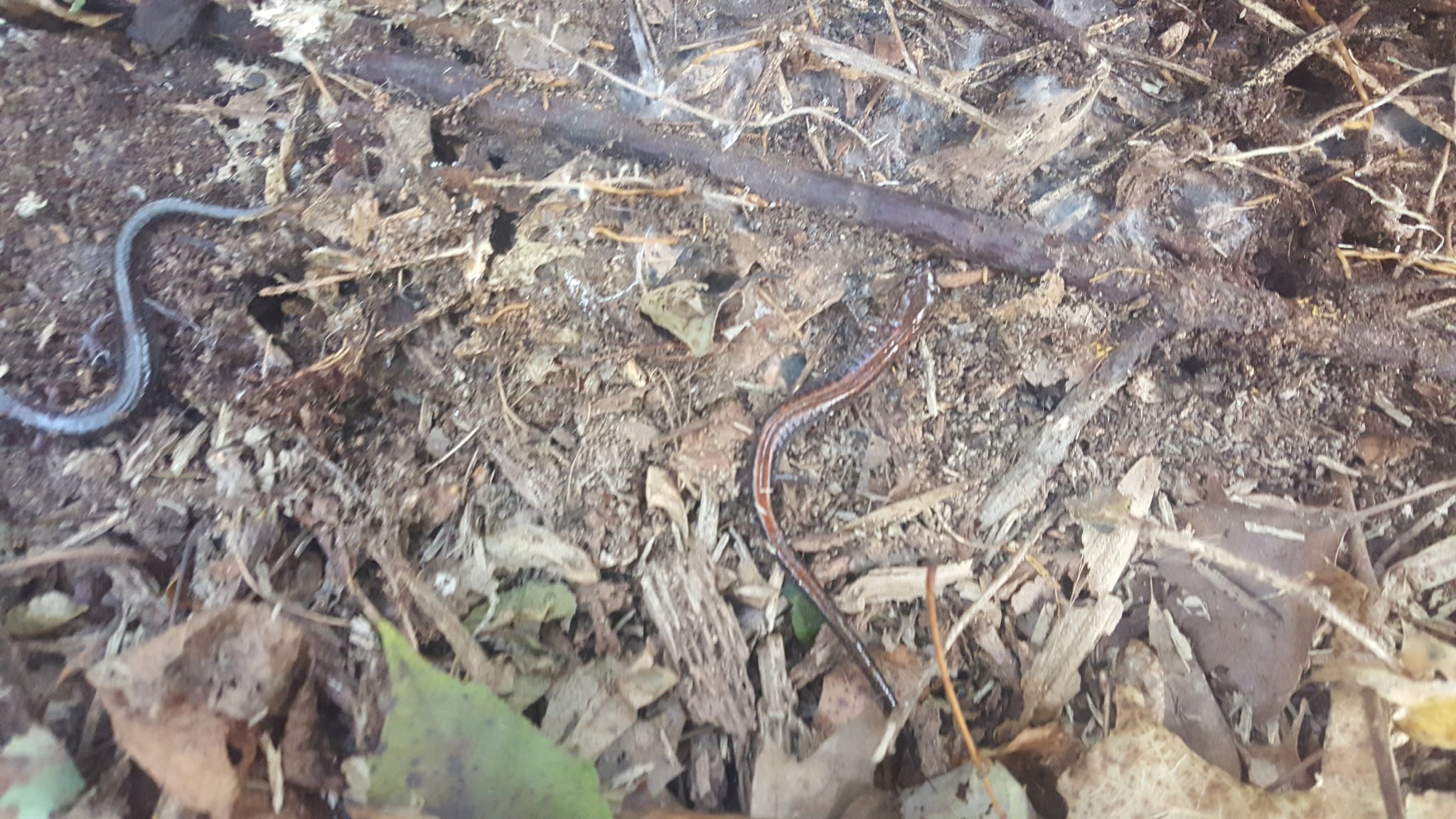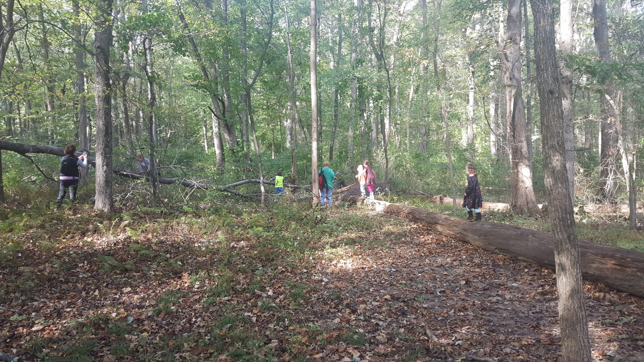 Once in the woods we had some freeplay/exploration time. I love watching kids play in the woods when there are no instructions. Some of the things that naturally occurred included tree climbing, tree balancing, imaginative play, building with natural materials, and checking out the red-backed salamanders (Plethodon cinereus) that Ms. Colleen helped us find! We even found both color variants, the red striped one and the darker one known as lead backed!