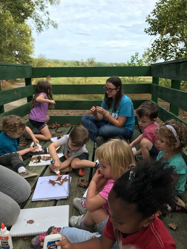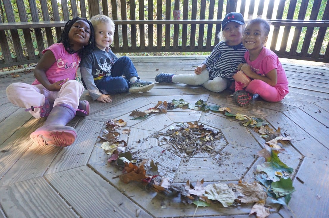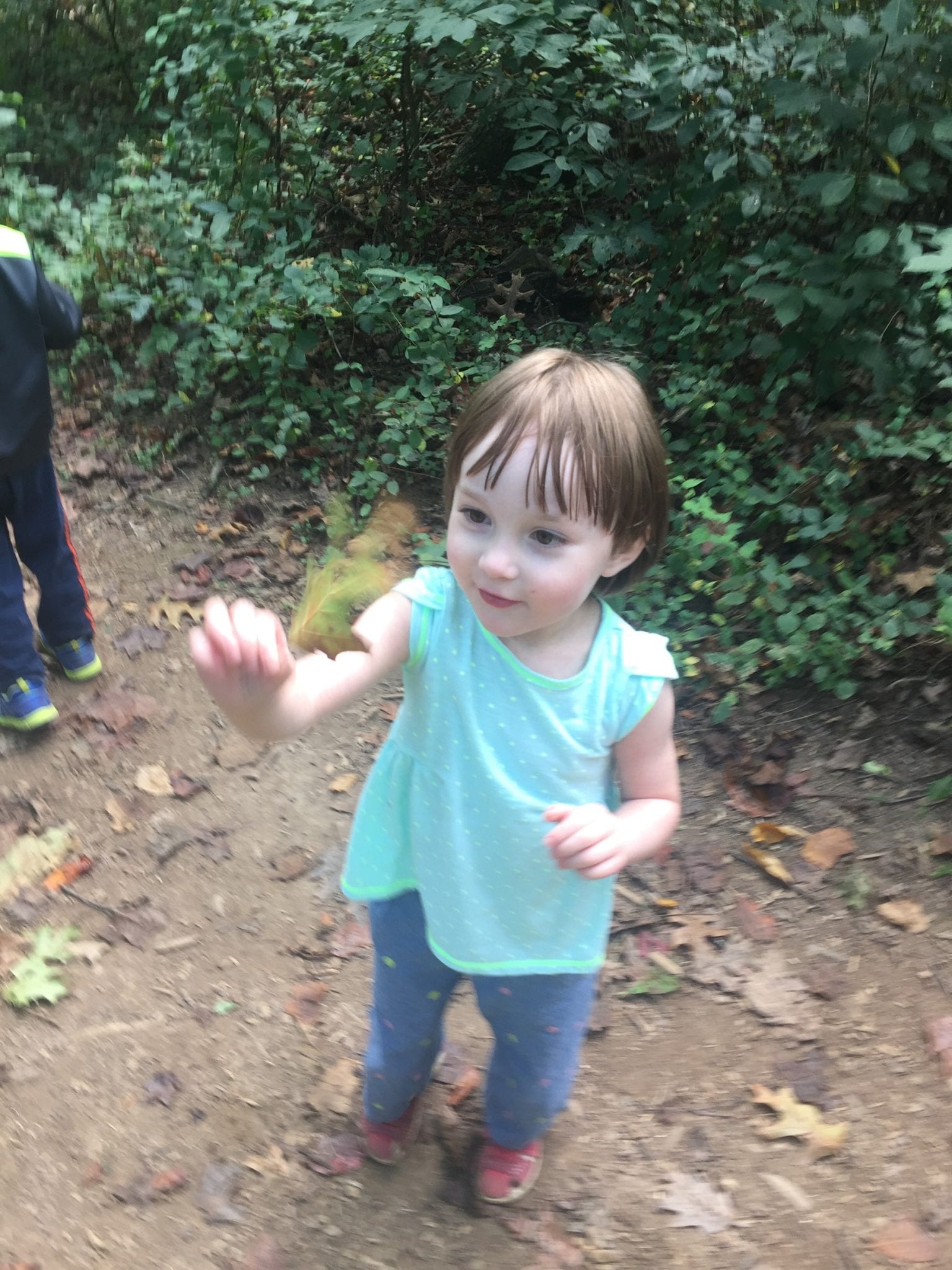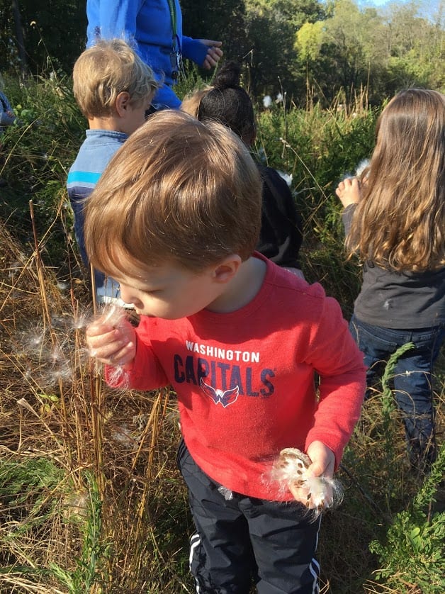October brings conversations and observations of changes. Changing temperatures, changing colors, changing animals, changing daylight hours, and so on. We visited the new wetland area, opened up black walnuts, danced with colored scarves, made rainbows out of leaves, blew wishes onto dandelions, saw live animals up close, sang songs, drew pictures, climbed trees, practiced the letter “L”, and so much more! We learned about Fall treasures like pumpkins, gourds, and apples. That tied in with talking about the Autumn harvest. And to top it off we invited our families to join us on a harvest hike and take a hayride in Mr. Wally’s wagon!