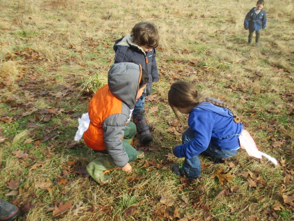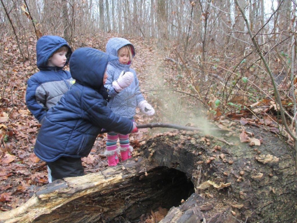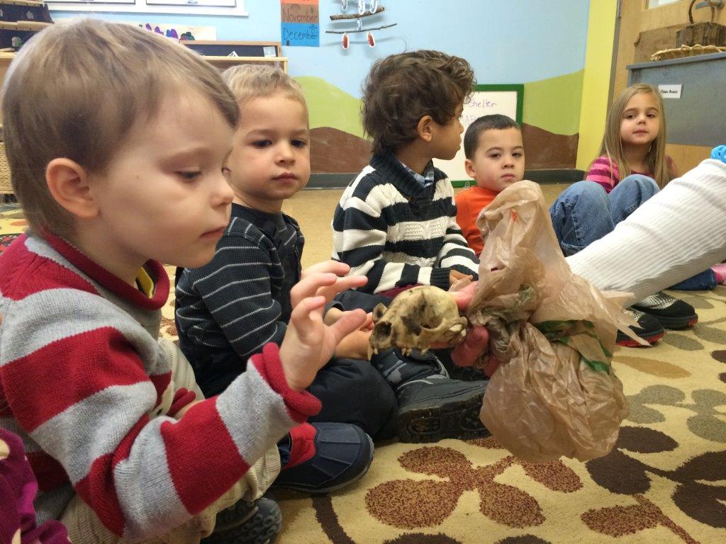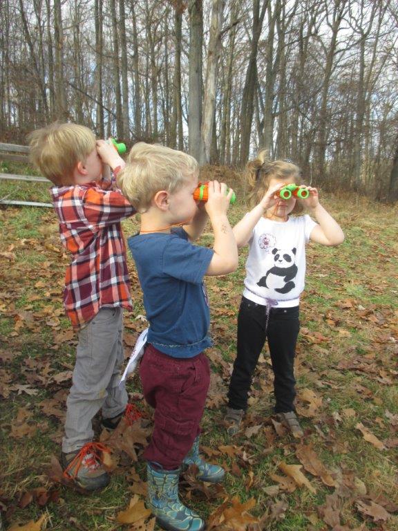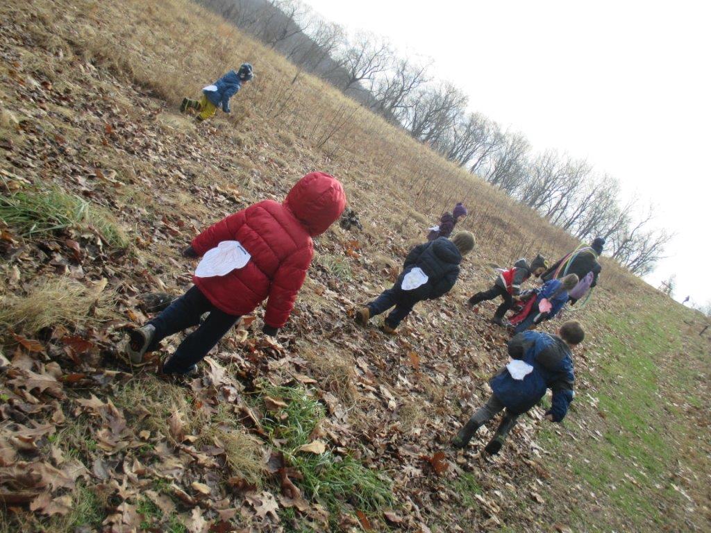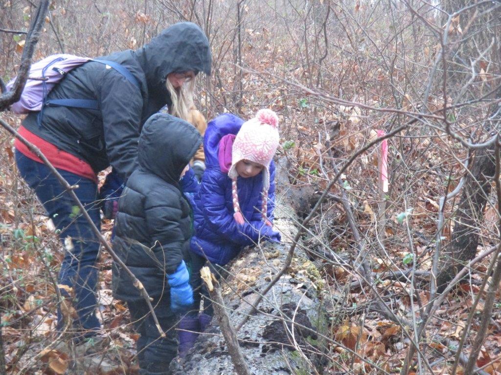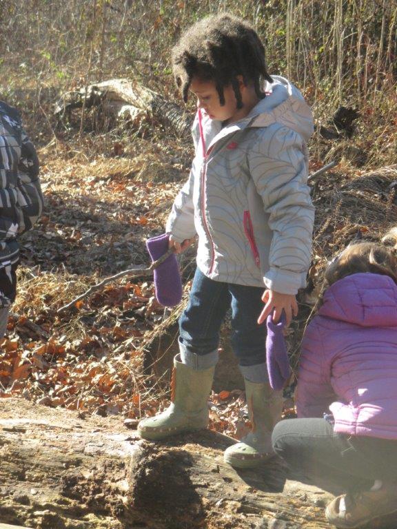 Everyone is planning on getting warm this winter! How do you stay warm? How do animals stay warm during the long, cold winter? That was the question on everyone’s mind this week! We learned about hibernation, migration and adaptation through games, discussions, and hands on exploration. Out on the trails we kept our eyes peeled for any area that looked like a good place for an animal to cozy up for the cold months. If we saw a hole in the ground, a hollowed out log, or nook under the rocks we called out, “Hibernation Station!” and gathered round to explore! We humans prepare for winter by wearing warming clothing, adjusting to the shortened daylight hours, and stocking our kitchen cupboards! How do animals adapt to make it through winter? Some animals get harder to see because they change color to camouflage with the bare branches or white snow. Out on the trail we hid several different woodland puppets and the children used their best “owl eyes” to search out those camouflaged critters!
