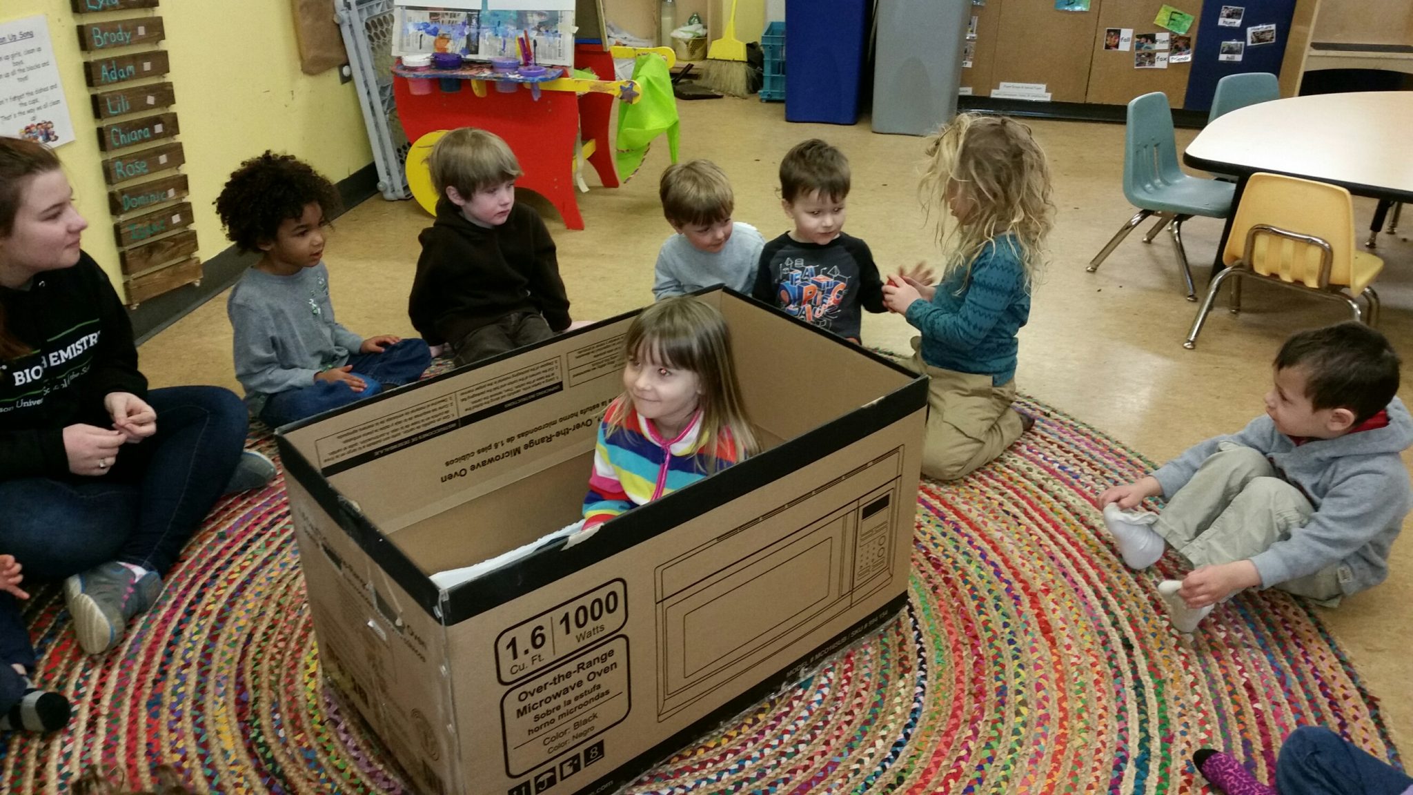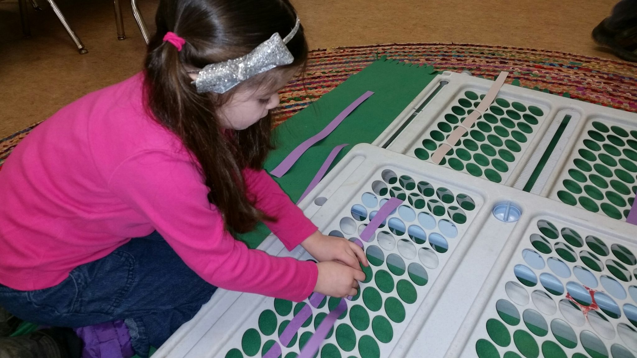 -The Chipmunks made a variety of their own nests (in the sensory bin, in baskets, in kid-sized boxes, on the arts table, outside and in a milk chocolate snack!) The practiced their weaving skills on an old baby gate and played a game of hot egg (instead of hot potato). Outside they used windy days to have a feather races and fly recycled kites.