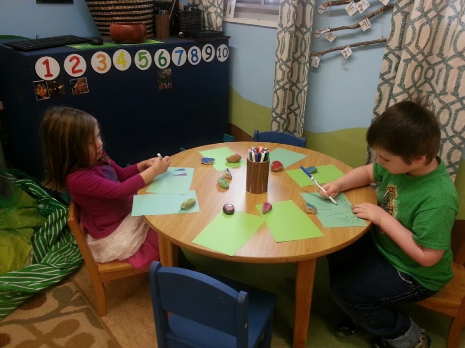- The writing table is inviting with stones and markers.