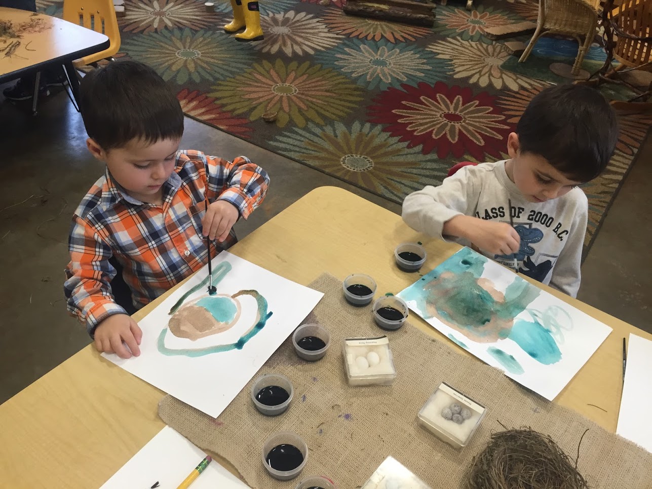 - Watercolors and nesting materials provide an open ended art activity! They children used the egg carton as a stencil to paint speckled eggs.