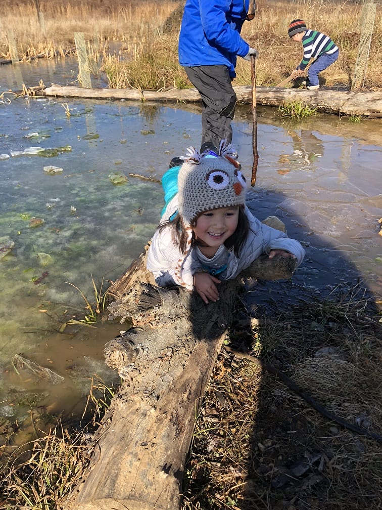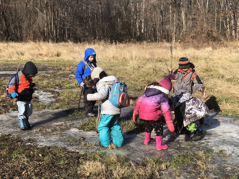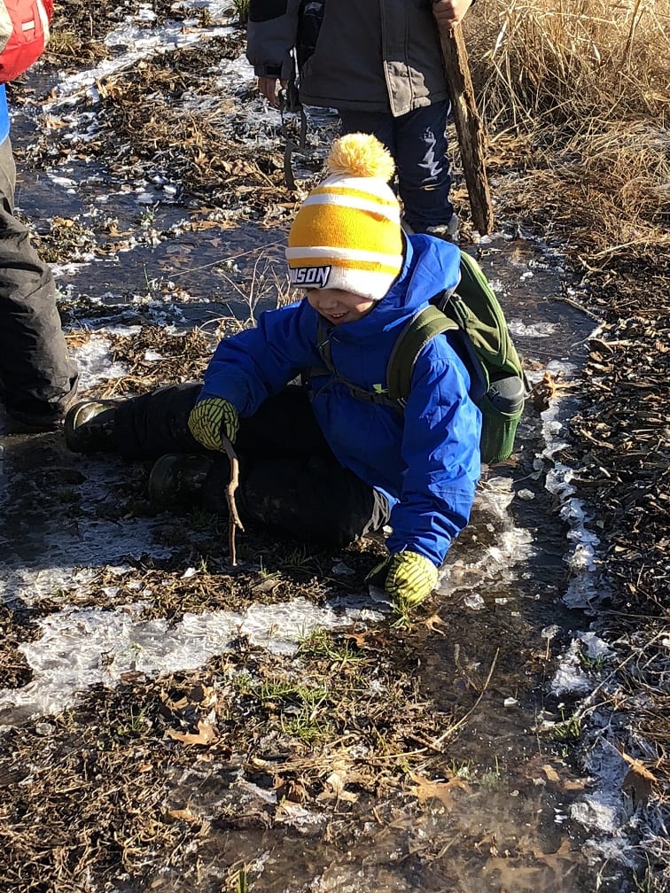 Finally, we made it to the ponds. After seeing children start to walk on the inch-thick ice, we set some ground rules! The temptation to walk on the ice was so great that we had to sit everyone down and talk about ice safety and why we don’t blindly walk on icy ponds. We talked about depth of the ponds and thickness of ice! This also led to a discussion about ice fishing and how people drive cars on the ice to set up their shelters up north.