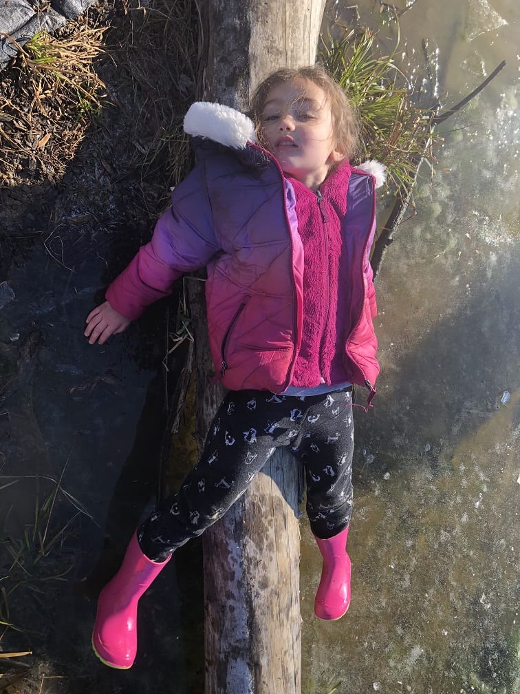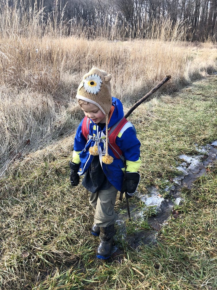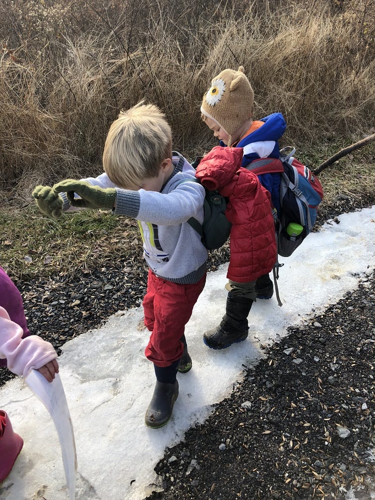 Today we had a HARD time moving. This was our last full day and we quickly made the decision to travel as a herd, school, swarm, pride, murder, gaggle…well, you get the picture. We had to travel together today 🙂 After exploring Irvine’s 200 plus acres for 13 weeks, the kids were VERY familiar with where they wanted to go! Whereas we initially set off for the larger back ponds, we were constantly side tracked but the frozen puddles along the way! Needless to say, we didn’t make the back ponds.