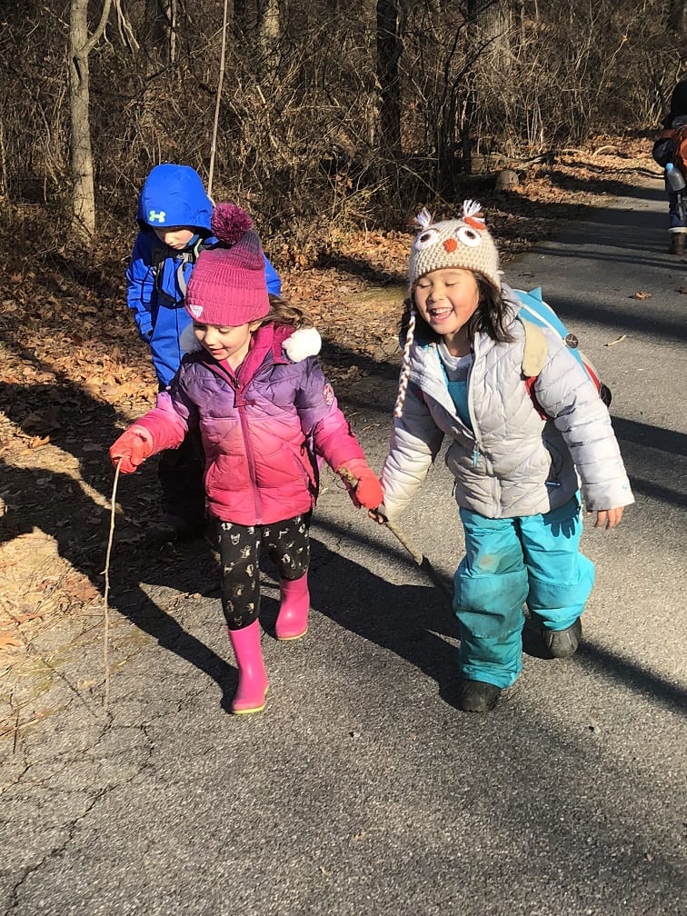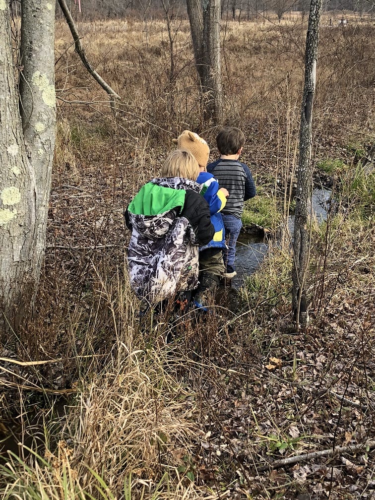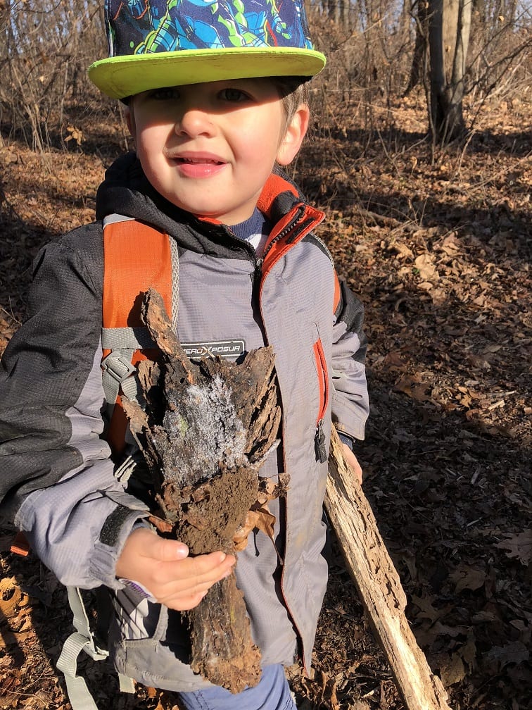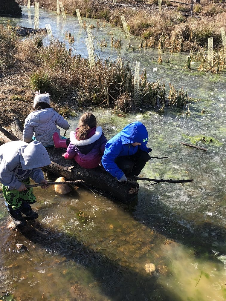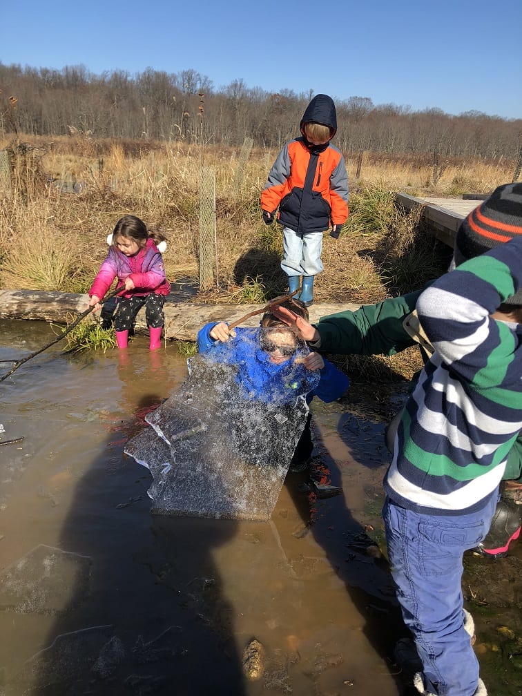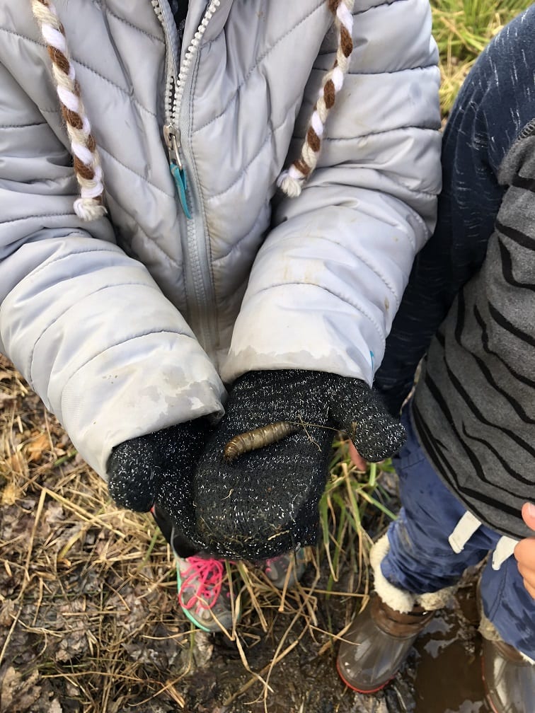 The ponds looked frozen as we approached but as the kids threw sticks on the water, they quickly made several holes on the surface. This caused excitement as the children proceeded to harvest the ice and even enjoy a frozen treat of “icicles”.  They investigated the stream and found, to their amazement, some crane fly larvae. Everyone wanted to hold this discovery and watch the segments move as the larvae tried to escape their confinement. Who knew kids could have so much fun in the (near)winter!