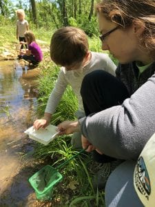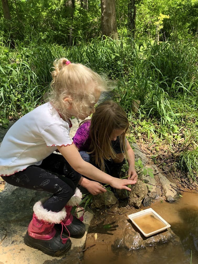 After talking to the children, we agreed to check out the Native American site. We hadn’t been there in weeks and we could stay dry in the longhouse. As we made our way down the rocky road, the children collected fallen paulownia and tulip poplar flowers, hoping to give them to their parents when picked up. We also stopped and checked out some birdhouses along the road. Everyone LOVES to find eggs and even better, baby birds inside the boxes.