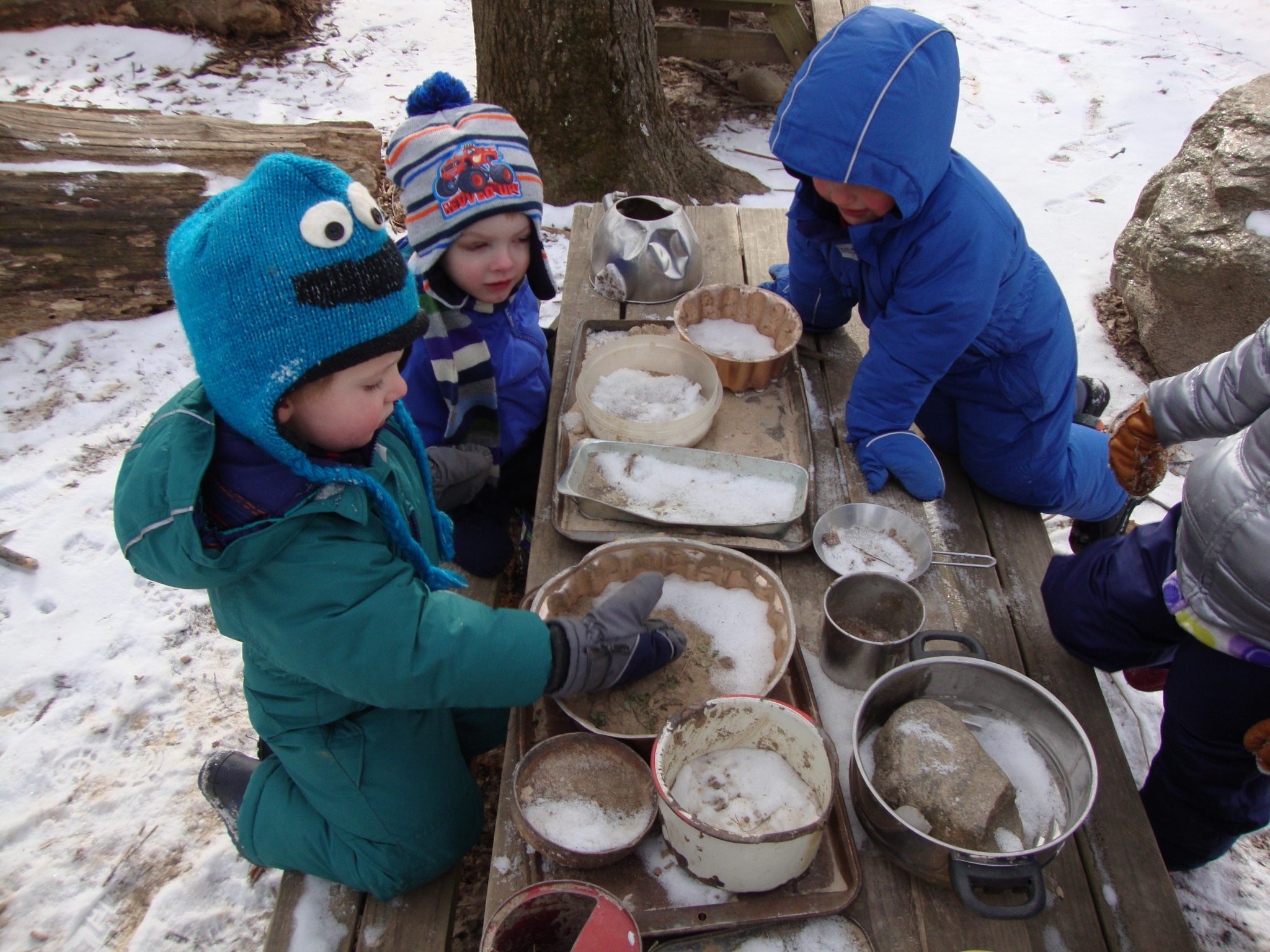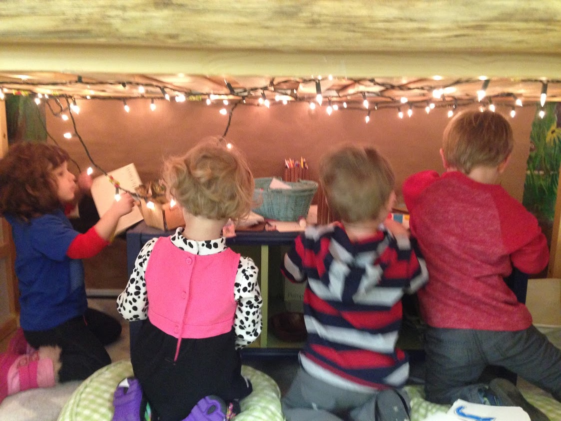 ~Going On A Bear Hunt by Michael Rosen was inspiration for dramatic play, storytelling, and exploring landscape features. Tall wavy grass, deep cold river, thick oozy mud, dark forest, swirling whirling snowstorm and a narrow gloomy cave. “Can’t go over it, can’t go under it, we’ll have to through it!”