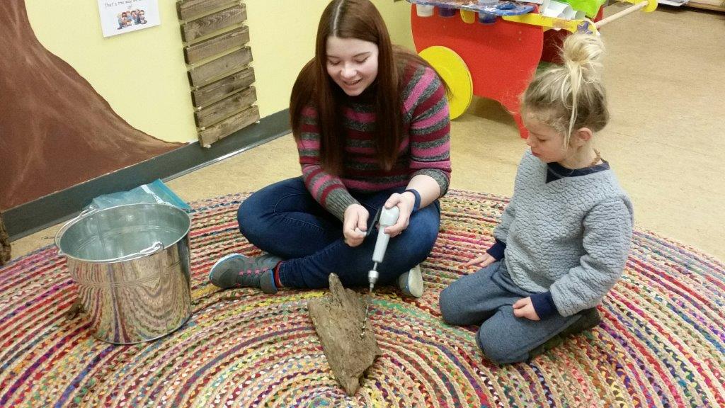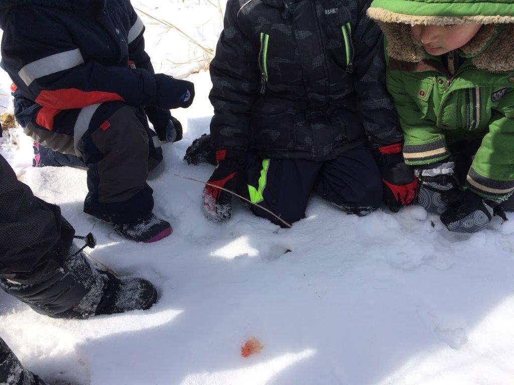 It’s that sweet time of year again and maple magic is calling! Nature Preschool has been exploring the maple sugaring process. The children were introduced to all the tools needed to collect sap. They used buckets, spiles, and hand-crank drills to practice tapping trees! As we hiked through the winter forest the children tried to spot woodpeckers, who are especially active during the sugaring season. Inspired by the woodpecker, we sang songs and used sticks to tap rhythmic beats on the trees. We also kept our eyes out for maple trees! They were easy to spot since they had buckets hanging from them collecting sap, but we also noticed the texture of the bark, the branching patterns and the shape of the leaves on the ground underneath. Everyone was excited to hike to Irvine’s very own sugar shack to see the evaporator boiling sap into syrup!