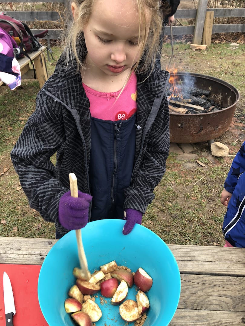 After some time at the ponds, our friends were ready to warm up and head back to Irvine for a campfire and roasted “toffee” apples! We discussed the three elements that a fire needs to burn and (unfortunately for us) what hinders a fire. Moisture! I say unfortunately because with all the rain and the frost, it took us almost an entire hour to get some good coals! Thankfully, the kids were able to quickly roast their apples over the flames as the dry grasses caught!