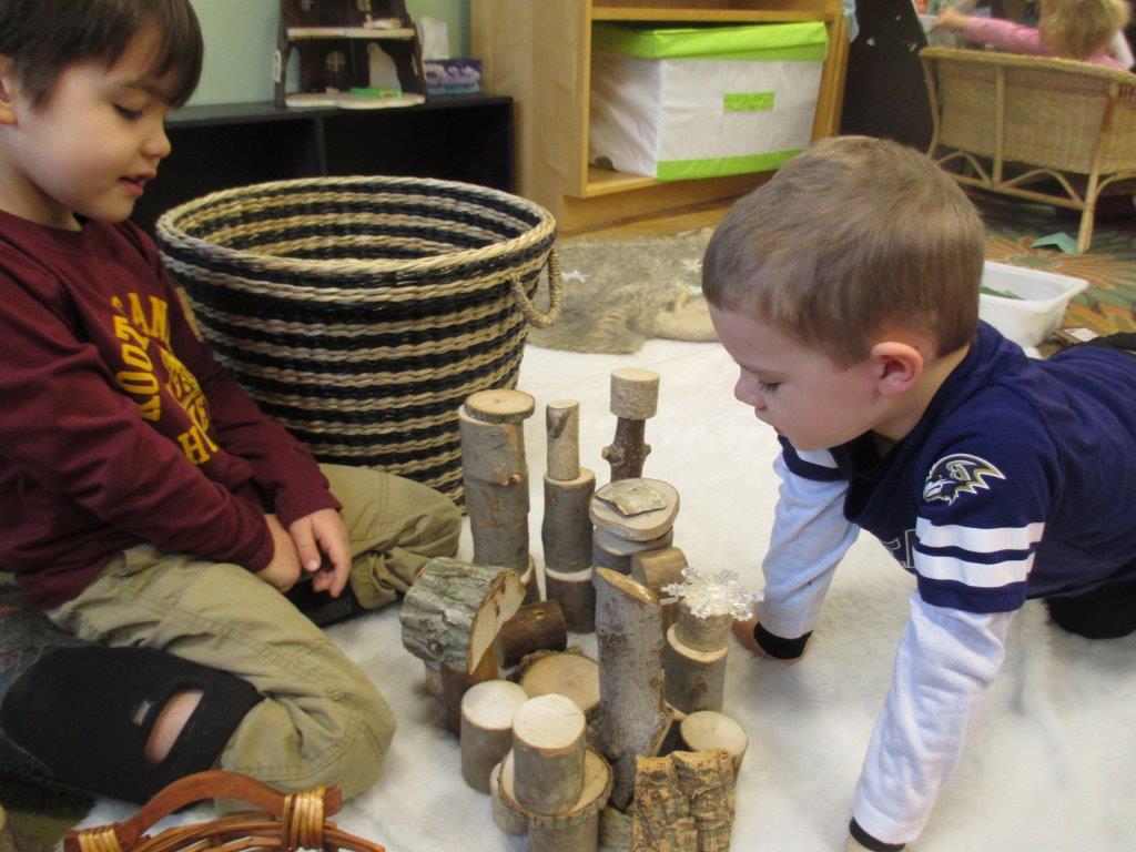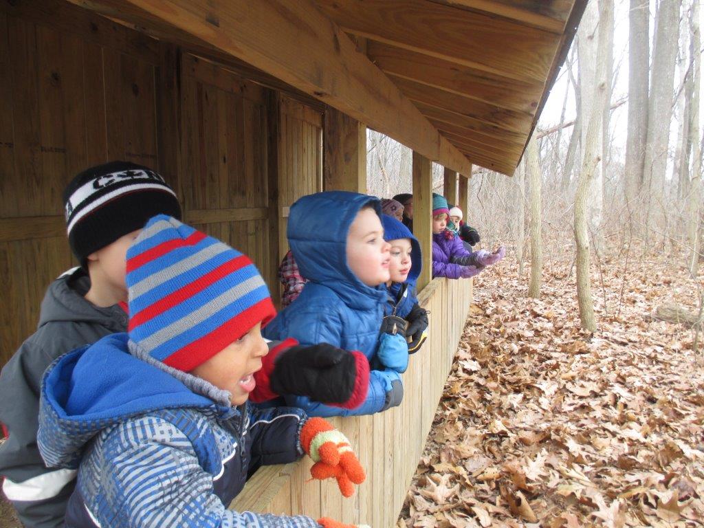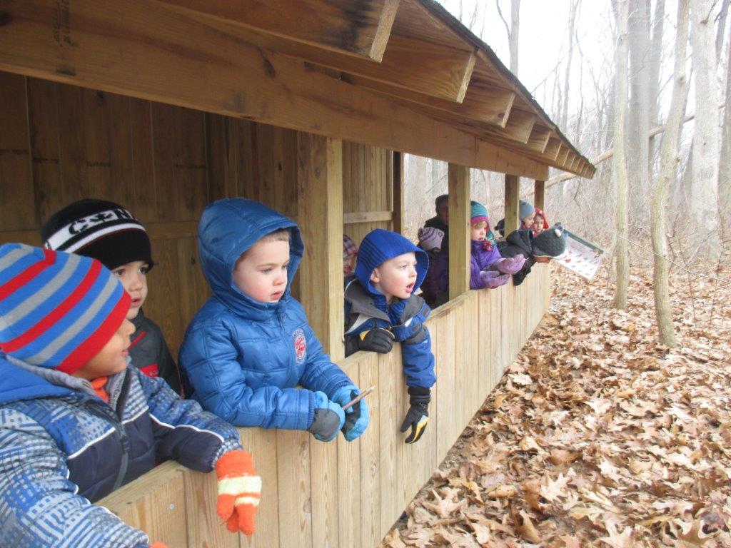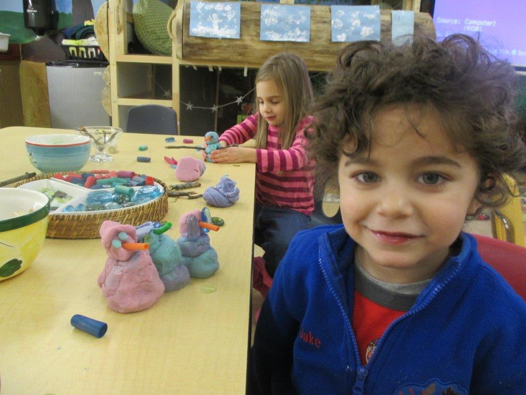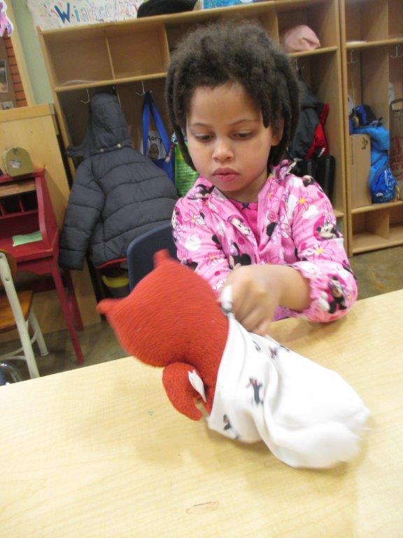 The Nature Preschool had an exciting week! We all enjoyed getting warm and cozy after reading the story The Mitten by Jan Brett. The children enjoyed using small puppets, magnet or felt boards, and their imaginations to act out the story. We used mittens for so many fun activities! We painted with them, hid them in the woods to search them out, and used them to practice lacing. Some of the classes had a pajama day and brought in a special stuffed animal from home! The children used recycled fabric, needles and thread to sew blankets or sleeping bags to wrap their animals up in. We wanted our friends from home to get snug and toasty too! To help keep ourselves cozy, Mrs. Monica W. came into several of the classes with a sewing machine and helped the children make a quilt!