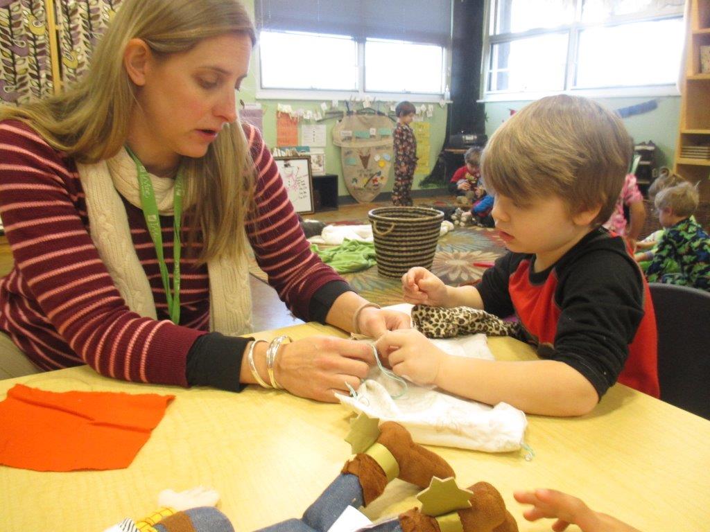 - Here the children are sewing fabric into sleeping bags and blankets for their stuffed animals they brought in for PJ day!
