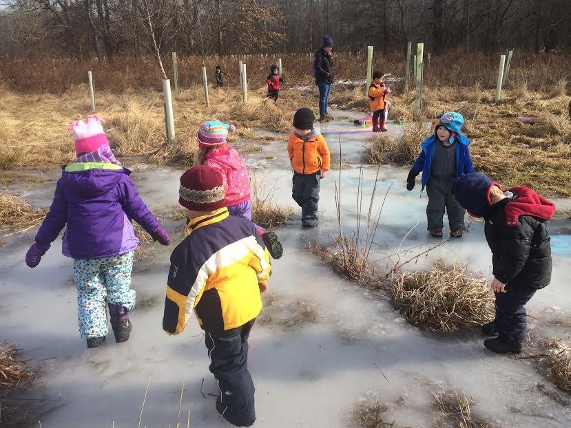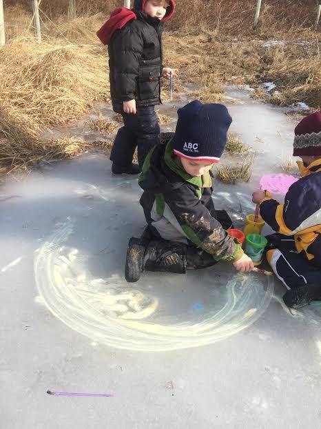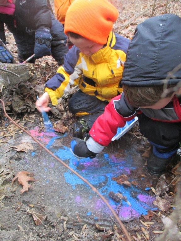 Out on the trails we had so much fun! We love snowy days! We saw lots of tongues out and mittens open trying to catch snowflakes as they softly fell. The squirrel club made some super fun spray bottles filled with colored water. They shared them with all of us and the children absolutely loved creating rainbow snow! Outside we made crunchy footprints, while observing how snow makes a layer on benches, logs and on the ground. We kept our eyes peeled for animal tracks, but the children became very interested in human tracks as well. The children asked questions like, “Who left those BIG footprints?”, “Where do you think they were walking to?” We decided to hike to the meadow where we enjoyed, as quoted by one of our students, “The best sledding day ever!” Some children noticed “tipi” like structures in the woods and wanted to make one of their own. In groups of two and three they worked together to haul giant branches and balanced them just the right way! The children’s imaginations ran wild as they pretended their structure was a den or cave! They were all different animals protecting the home they had built. Deep in the meadow we found a GIANT frozen puddle, and the children had a blast skating, sliding and painting on the ice! Another one of our favorite discoveries outside was an owl pellet. Upon dissecting it, the curious children found bones and fur! It was a fabulous impromptu lesson about how owls eat and process their food. What a phenomenal example of the child led learning that takes place here at the Nature Preschool at Irvine!